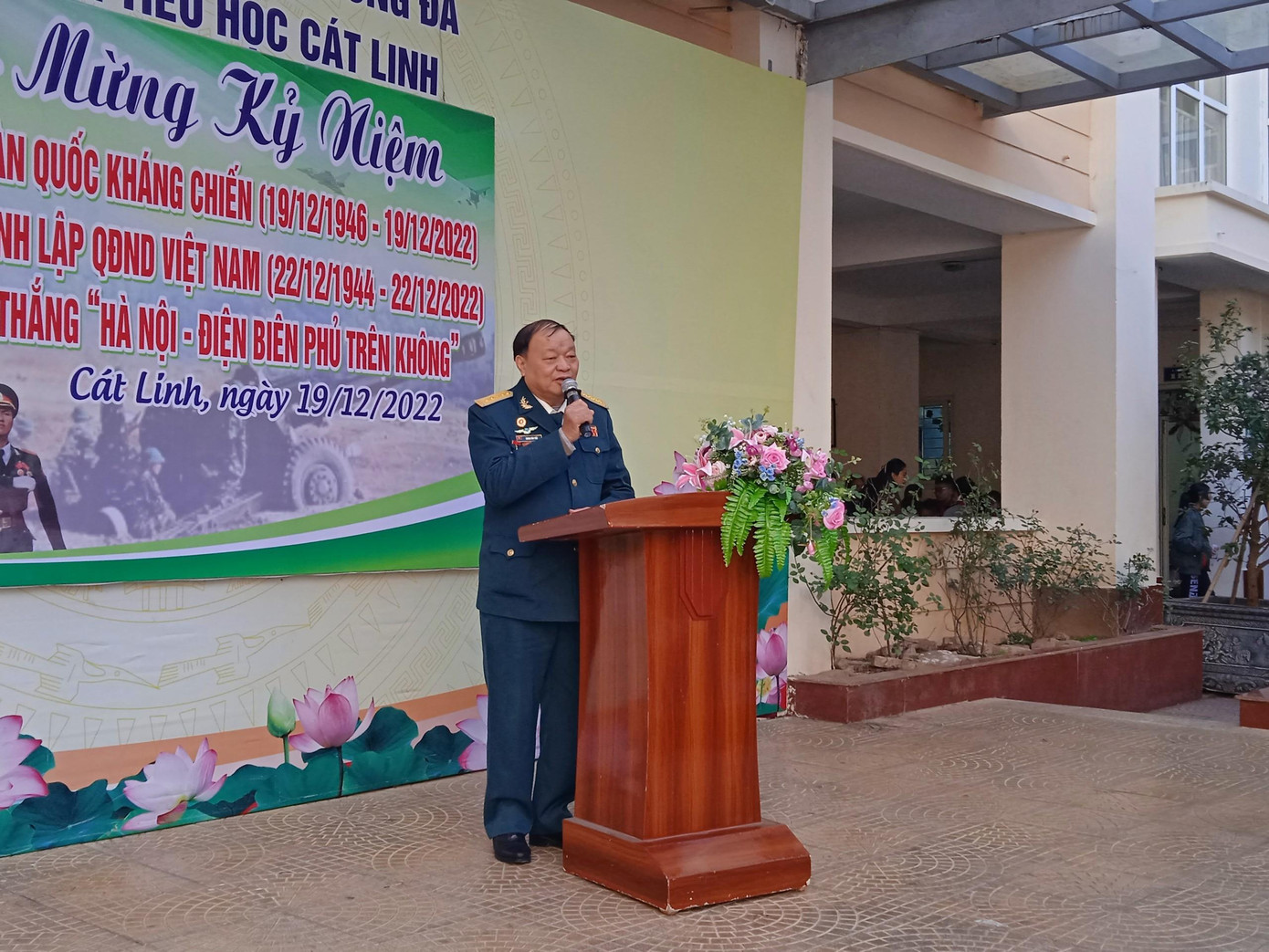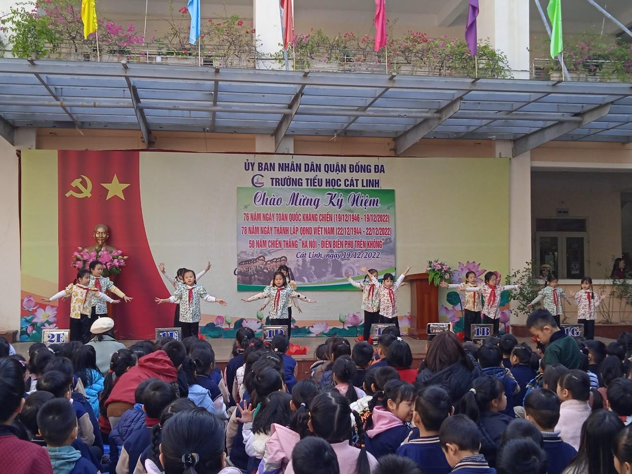 Sáng 19/12, thầy và trò trường Tiểu học Cát Linh đã cùng ôn lại lịch sử vẻ vang của dân tộc nhân kỷ niệm 78 năm ngày thành lập Quân đội Nhân dân Việt Nam và 50 năm chiến thắng Điện Biên Phủ trên không. Mở đầu chương trình, tween trường Tiểu học Cát Linh thích thú với tiết mục văn nghệ do các bạn học sinh tới từ lớp 1E và 5E biểu diễn.
