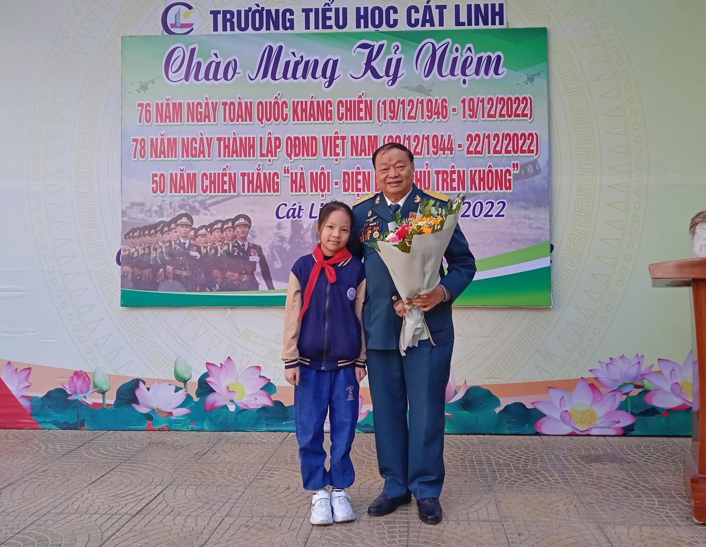 Khép lại buổi lễ, cô Hiệu trưởng Nguyễn Thanh Thủy gửi lời cảm ơn tới 2 vị Đại tá đã dành thời gian trò chuyện với thầy và trò trường Tiểu học Cát Linh. Phương Vy - Liên Đội Trưởng của trường, đại diện các bạn học sinh cũng tặng hoa và cảm ơn sự hiện diện của 2 khách mời đặc biệt.