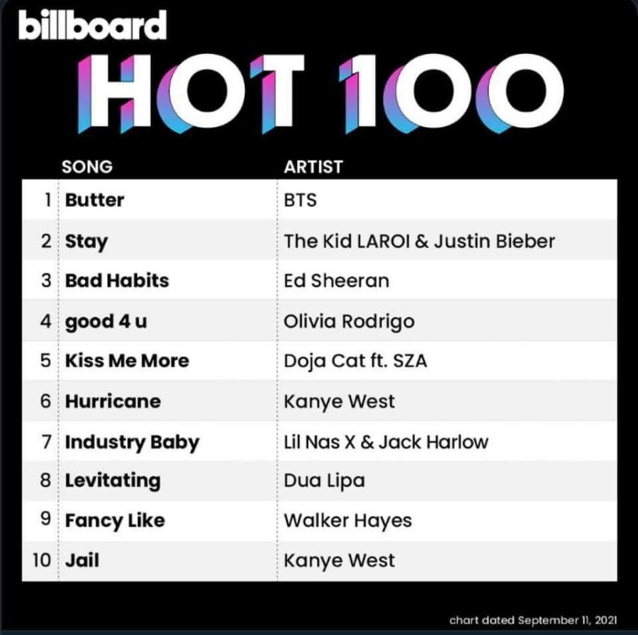 - Butter là ca khúc duy nhất trong năm nay (tính đến thời điểm hiện tại) sở hữu 10 tuần No.1 Billboard Hot 100.