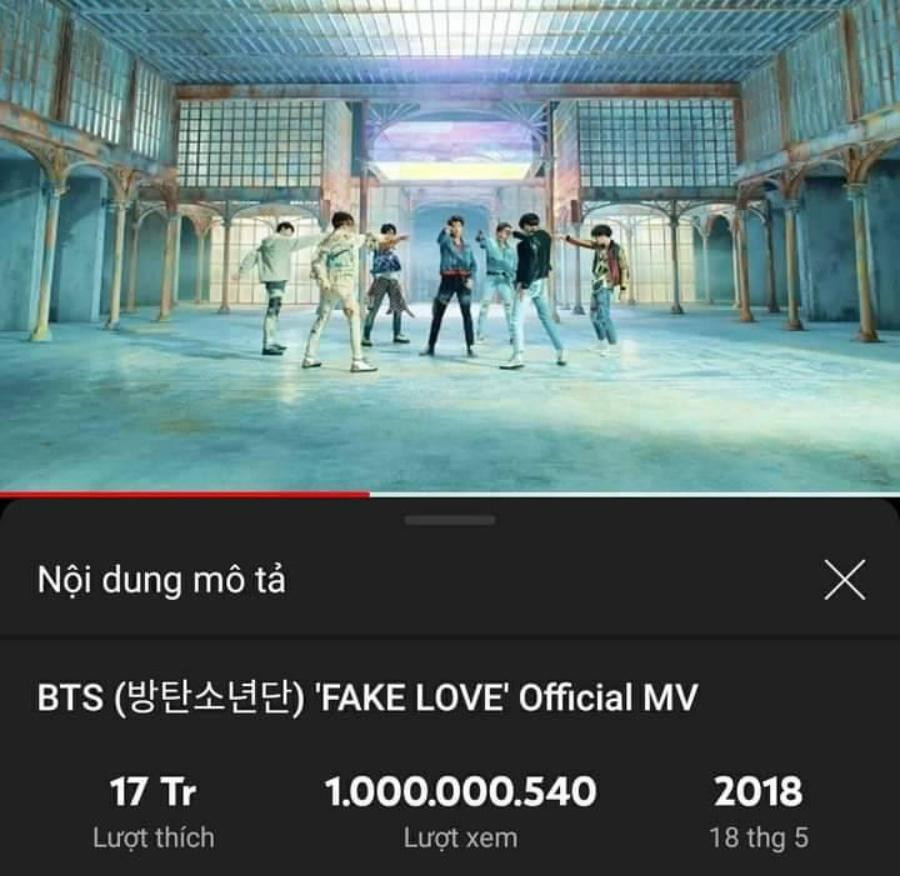 Fake Love của BTS được phát hành ngày 18 tháng 5 năm 2018, là một trong những bản hit đình đám trong sự nghiệp của nhóm. Đáng chú ý hơn nữa, BTS hiện có một MV nữa chuẩn bị cán mốc 1 tỉ view, đó chính là IDOL, ca khúc cũng được phát hành năm 2018 và hiện đang có 996 triệu view.