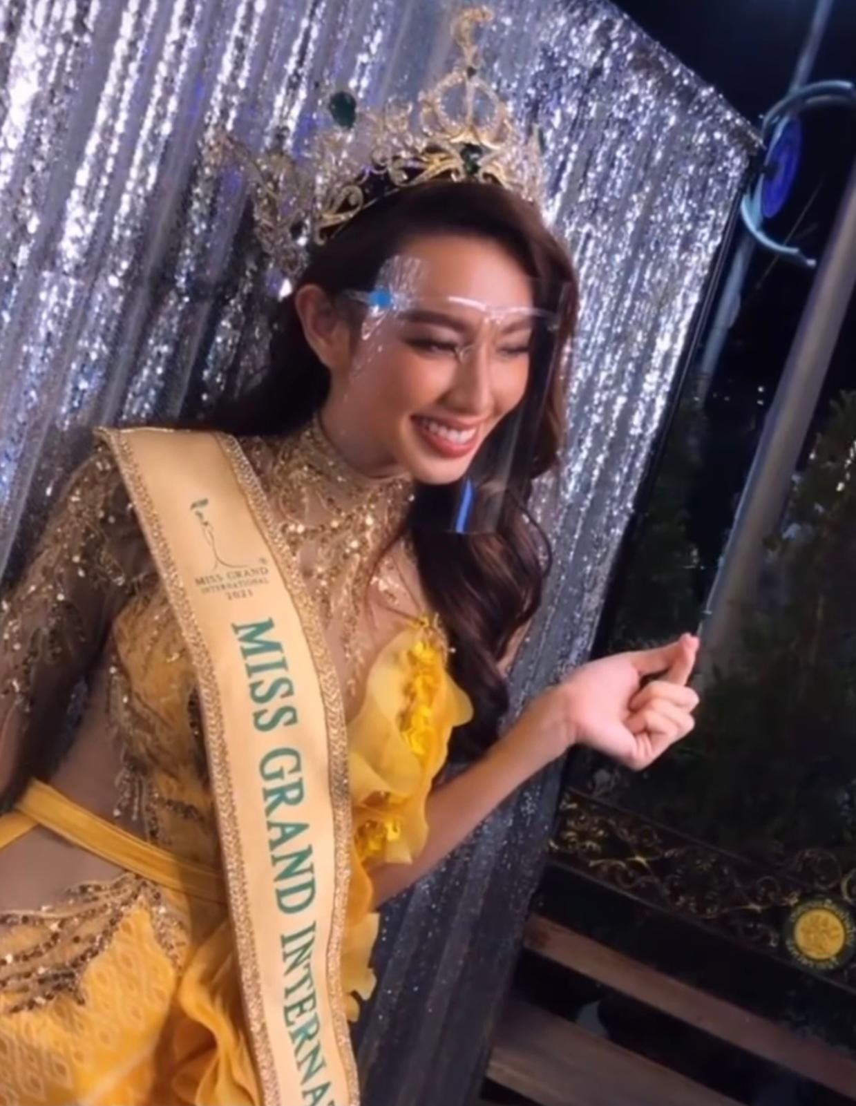 Trên đoạn video clip được các diễn đàn sắc đẹp đăng tải, Thuỳ Tiên diện bộ váy dạ hội xếp nếp độc đáo tông màu vàng, khoe trọn đôi chân dài quyến rũ. Người đẹp đeo khẩu trang và kính chắn giọt bắn trong suốt sự kiện để đảm bảo an toàn.