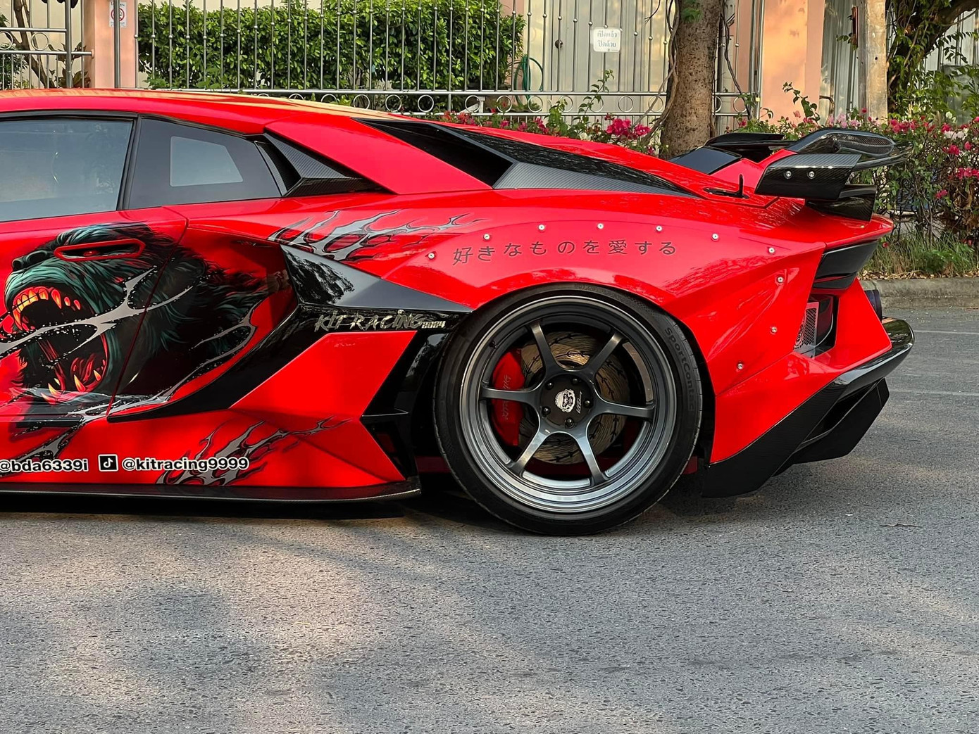 Nhưng điểm ấn tượng hơn cả của chiếc xe chính phải kể đến ngoại thất. Cụ thể, tất cả các miếng ghép thân xe đều được Kit Racing chế tác thủ công để có độ hoàn thiện cao, bám sát thiết kế nguyên bản của Aventador. Thậm chí xe còn có một cánh gió lớn giống như trên Aventador SVJ cùng bộ chia gió trước, khe hút gió lớn, vòm bánh rộng và một bộ mâm độ hầm hố.
