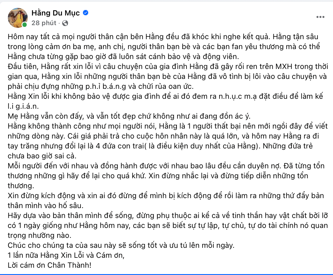 Bên cạnh đó, Hằng Du Mục cũng gửi lời xin lỗi tới người thân, bạn bè cũng như cộng đồng mạng, những người yêu mến Hằng vì những ồn ào trong thời gian qua đã khiến mọi người phải bận tâm, phiền lòng.