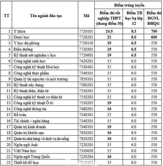 Cụ thể, Trường ĐH Nguyễn Tất Thành có điểm chuẩn cao nhất là ngành Y khoa với 24,5 điểm. Kế đến là ngành Dược học lấy 21 điểm. Điểm cụ thể các ngành khác như sau: