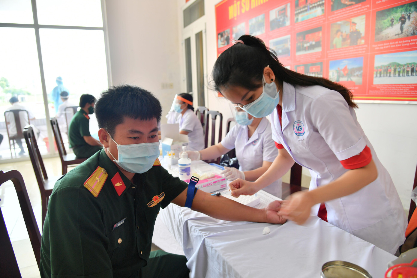 | Cán bộ, chiến sĩ tham gia hiến máu được test nhanh COVID-19. |