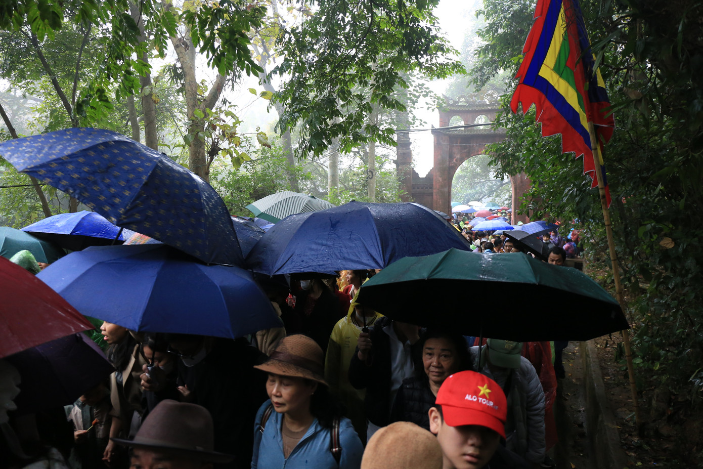 | Người dân che ô, khoác áo mưa, bước chậm rãi trên nền đất ẩm ướt, tiến dần lên đỉnh núi Nghĩa Lĩnh để thắp nén hương tưởng nhớ tổ tiên. |