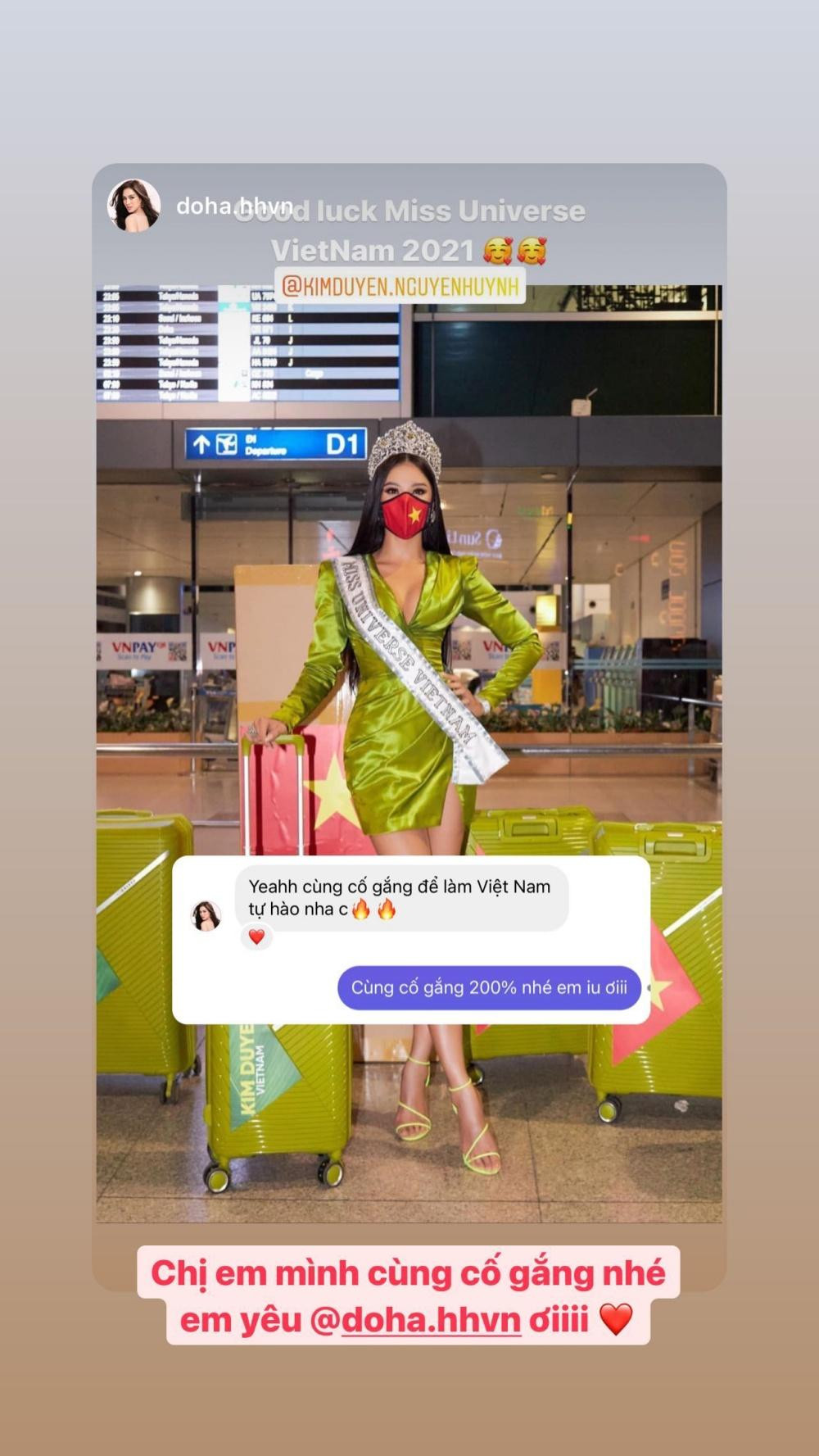Đặc biệt, Hoa hậu Đỗ Thị Hà, người đang đại diện Việt Nam thi đấu tại Miss World (Hoa hậu Thế giới) 2021 cũng không quên gửi lời chúc tới Á hậu Kim Duyên. Hai nàng hậu động viên nhau cùng cố gắng để mang niềm tự hào về cho quê hương đất nước.