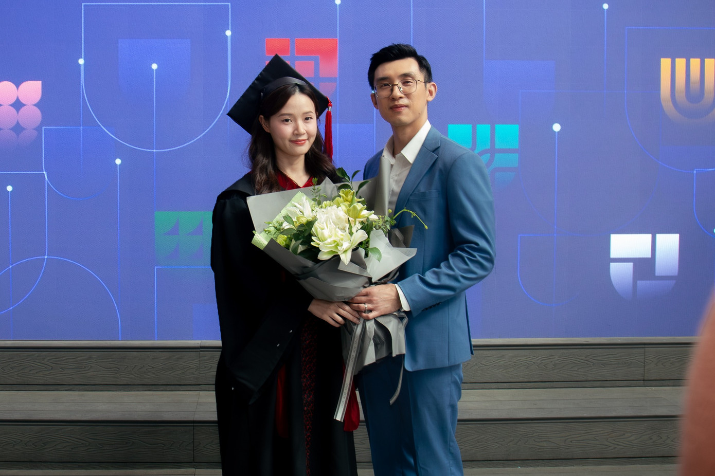 Trong buổi nhận bằng tốt nghiệp, Midu vô cùng xinh đẹp rạng rỡ và tất nhiên không thể thiếu nửa kia bên cạnh. Doanh nhân Minh Đạt lịch lãm trong bộ vest xanh tới tặng hoa chúc mừng bà xã. Dù đã có sự nghiệp kinh doanh thành công, đang là giảng viên ngành Thiết kế thời trang nhưng Midu vẫn muốn học tiếp vì muốn hoàn thiện bản thân hơn nữa.