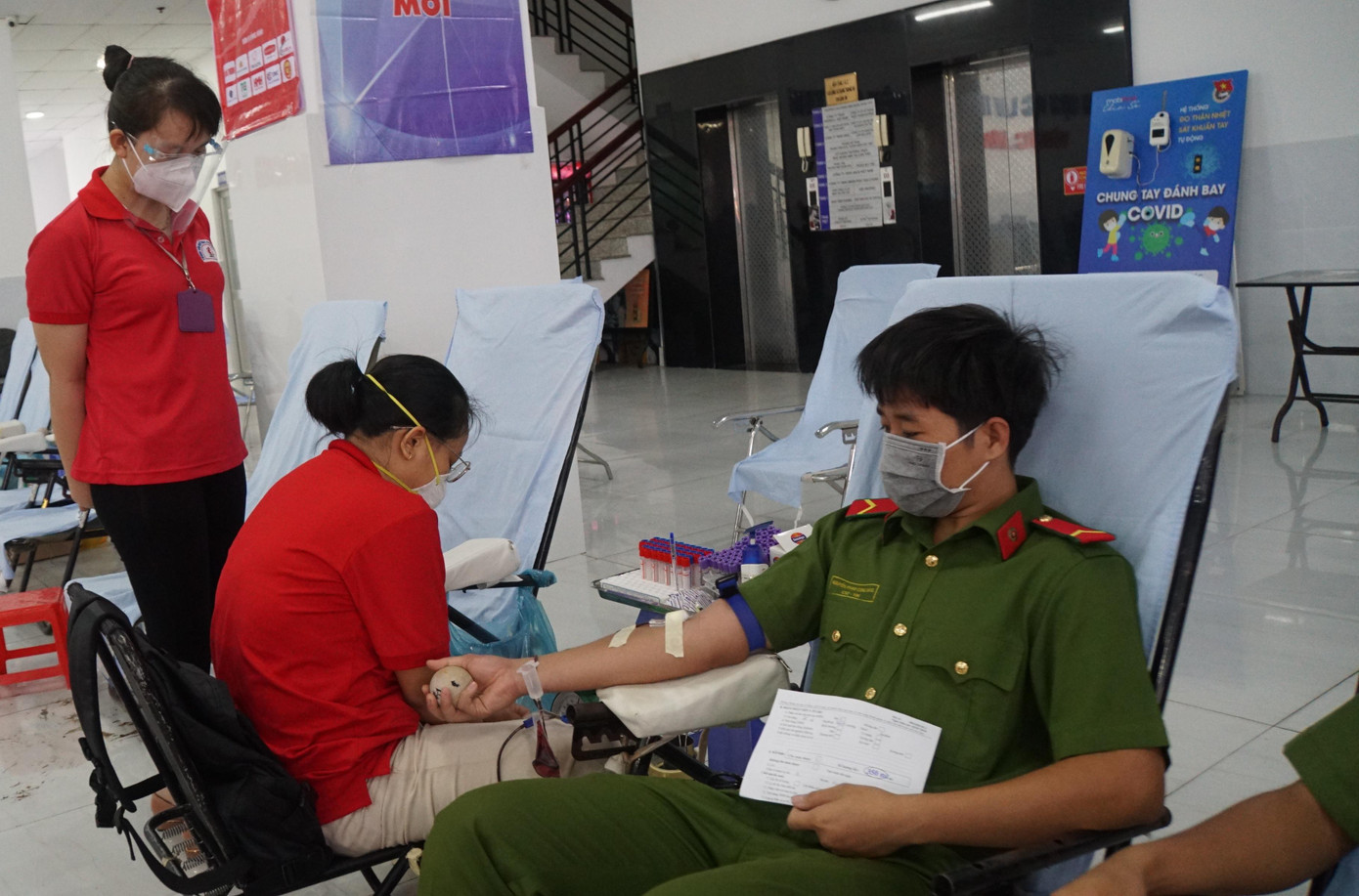 | Chiến sĩ công an nhiệt tình tham gia hiến máu. |