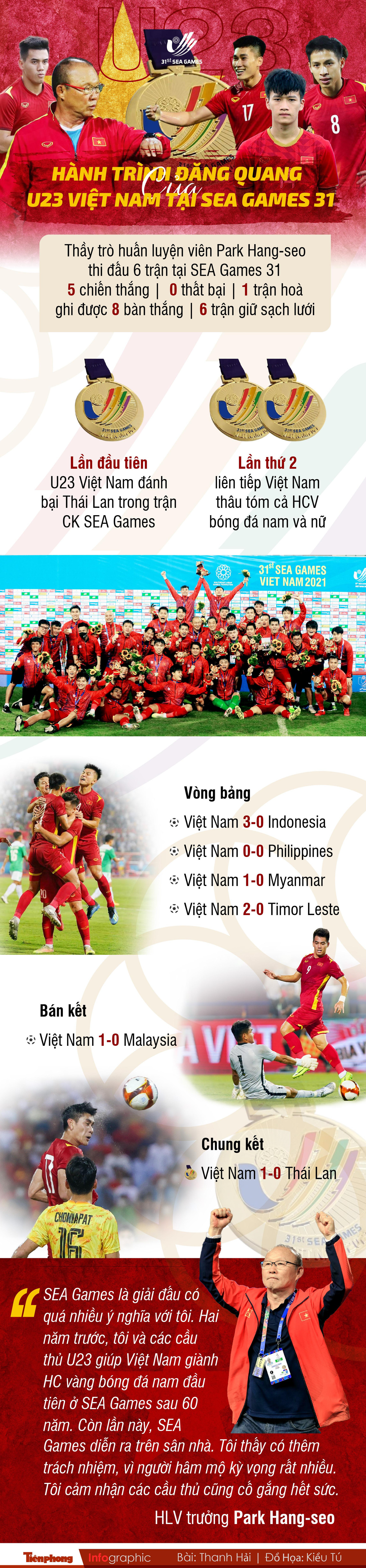 TPO - Đội tuyển U23 Việt Nam đã chính thức giành huy chương vàng bóng đá nam SEA Games 31. Đoàn quân của ông Park Hang-seo thi đấu 6 trận, thắng 5, hòa 1 và không để thủng lưới.
