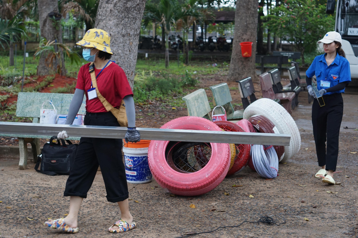 | Bạn trẻ xây dựng sân chơi thiếu nhi và sơn mới trường học địa phương. |