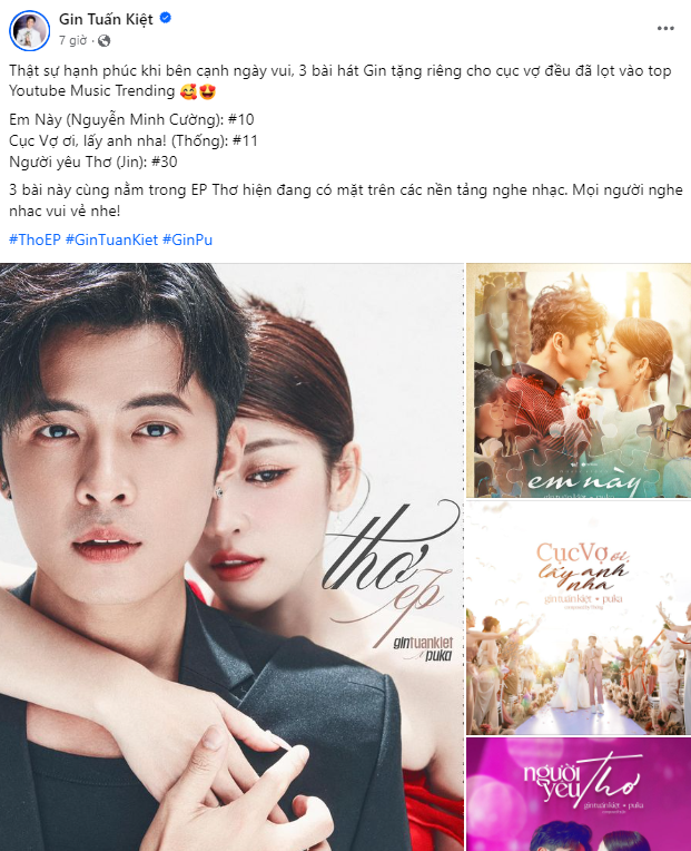 Cách đây không lâu, 3 ca khúc trong EP Thơ bao gồm: Em Này, Cục Vợ Ơi Lấy Anh Nha, Người Yêu Thơ của Gin Tuấn Kiệt đều lọt top trending của YouTube. Đây được xem như món quà ý nghĩa nam ca sĩ dành tặng vợ khi chính thức "về chung một nhà" và được lấy cảm hứng từ chính tên thật của Puka.