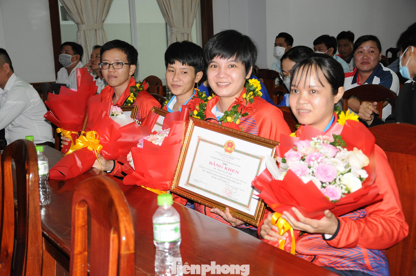 | Bí thư Tỉnh ủy và Chủ tịch UBND tỉnh Hậu Giang tặng bằng khen cho các VĐV. |