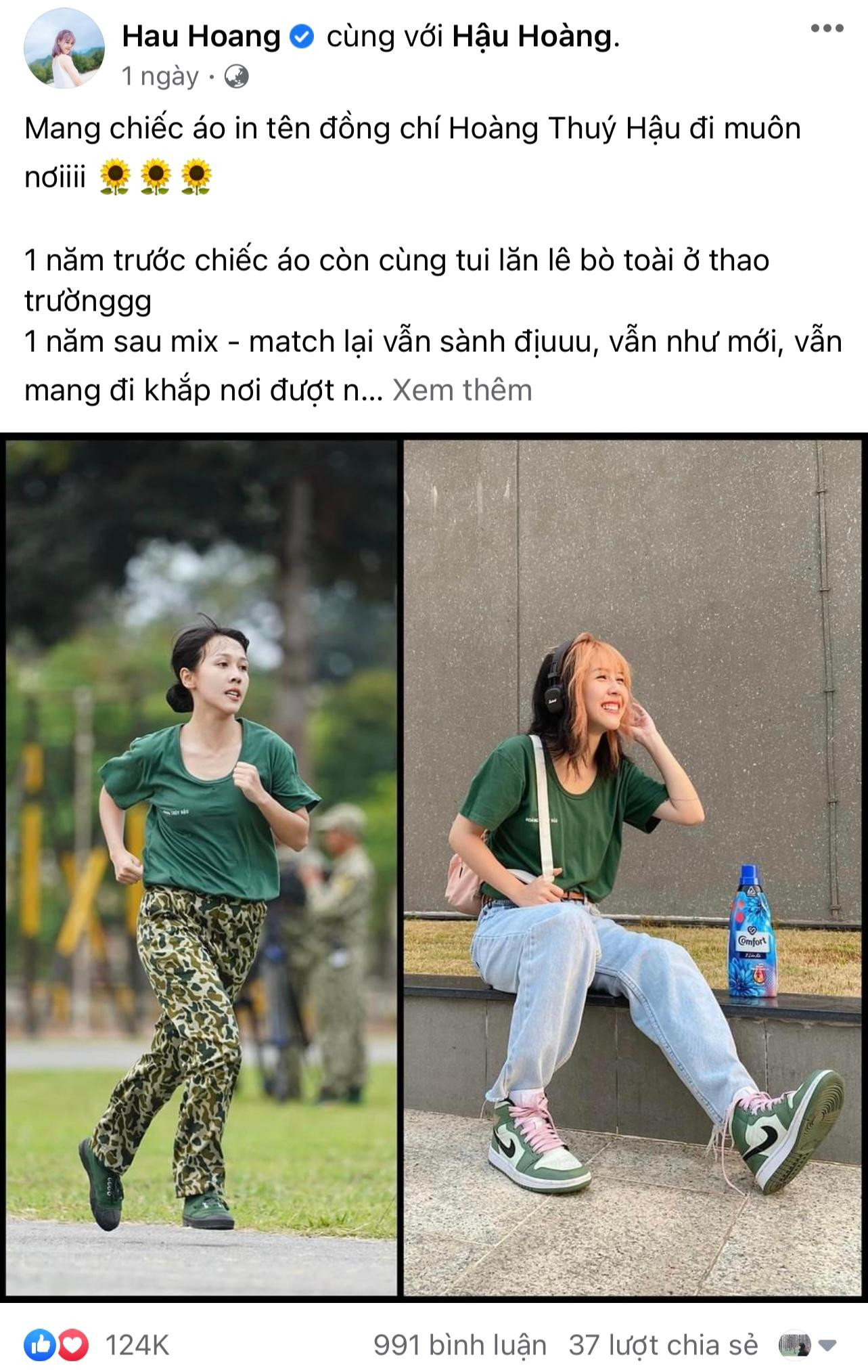 Mới đây, cô nàng đã chia sẻ ảnh với chiếc áo đáng nhớ từng đồng hành cùng cô ở thao trường trong những ngày ghi hình cho Sao Nhập Ngũ 2020. Sau khi kết thúc 7 ngày quay ở doanh trại, ê-kíp Sao Nhập Ngũ đã tặng Hậu Hoàng và cả các thành viên còn lại những bộ đồng phục sử dụng trong thời gian quay chương trình để làm kỷ niệm.
