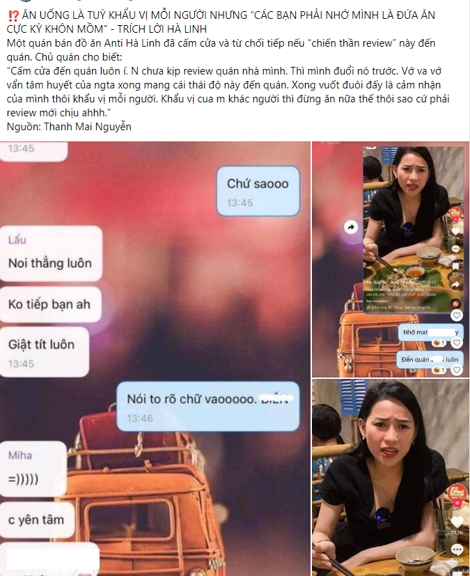 Mới nhất, cư dân mạng lan truyền hình ảnh chụp màn hình một vài đoạn tin nhắn cùng thông tin một chủ quán anti Võ Hà Linh tuyên bố cấm cửa và từ chối tiếp "chiến thần review". Dù thông tin chưa xác thực, nhưng không ít netizen chọn ủng hộ cho hành động của quán. Dù trước đó, Võ Hà Linh nhận về nhiều lời khen vì thái độ nhận xét, đánh giá đồ ăn chân thực.
