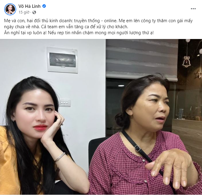 Về phía Võ Hà Linh, tối 10/4, cô cập nhật trạng thái mới nhất, cho biết đã liên tục tăng ca vài ngày chưa về nhà. Mẹ của cô lo lắng cho con gái nên đã lên công ty thăm: "Mẹ lên công ty thăm con gái mấy ngày chưa về nhà. Cả team em vẫn tăng ca để xử lý cho khách. Ăn nghỉ tại văn phòng luôn ạ! Nếu rep tin nhắm chậm mong mọi người lượng thứ ạ!".