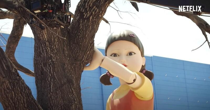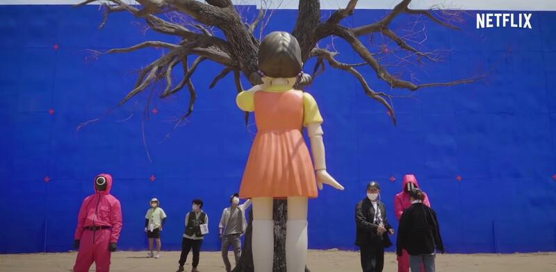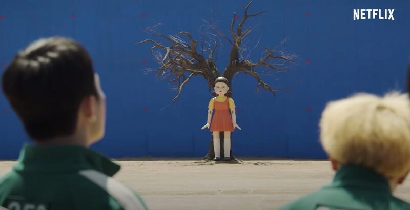 Trò chơi đầu tiên của Squid Game là “Đèn đỏ, đèn xanh”, nơi người chơi được một con búp bê rô-bốt khổng lồ quản trò và giám sát. Khi búp bê quay mặt vào thân cây, người chơi phải di chuyển tiến đến gần búp bê. Nhưng khi búp bê quay đầu lại nhìn vào người chơi, họ phải giữ mình bất động, ai nhúc nhích là thua cuộc.