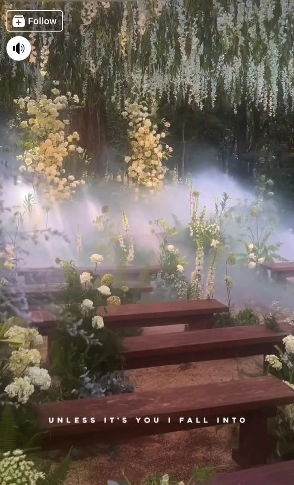 Khu resort này đã từng tổ chức nhiều đám cưới ngoài trời nhưng khi ngắm nhìn không gian hôn lễ của Midu, khán giả vẫn phải trầm trồ vì quá lộng lẫy, cầu kỳ. Khu vực làm lễ được phủ kín bởi những dải hoa trắng phía trên, nhìn như những đám mây bồng bềnh đẹp mắt. Những dãy ghế gỗ dành cho khách mời cũng được điểm xuyết hoa hồng trắng, hài hòa với cổng vòm nơi làm lễ.