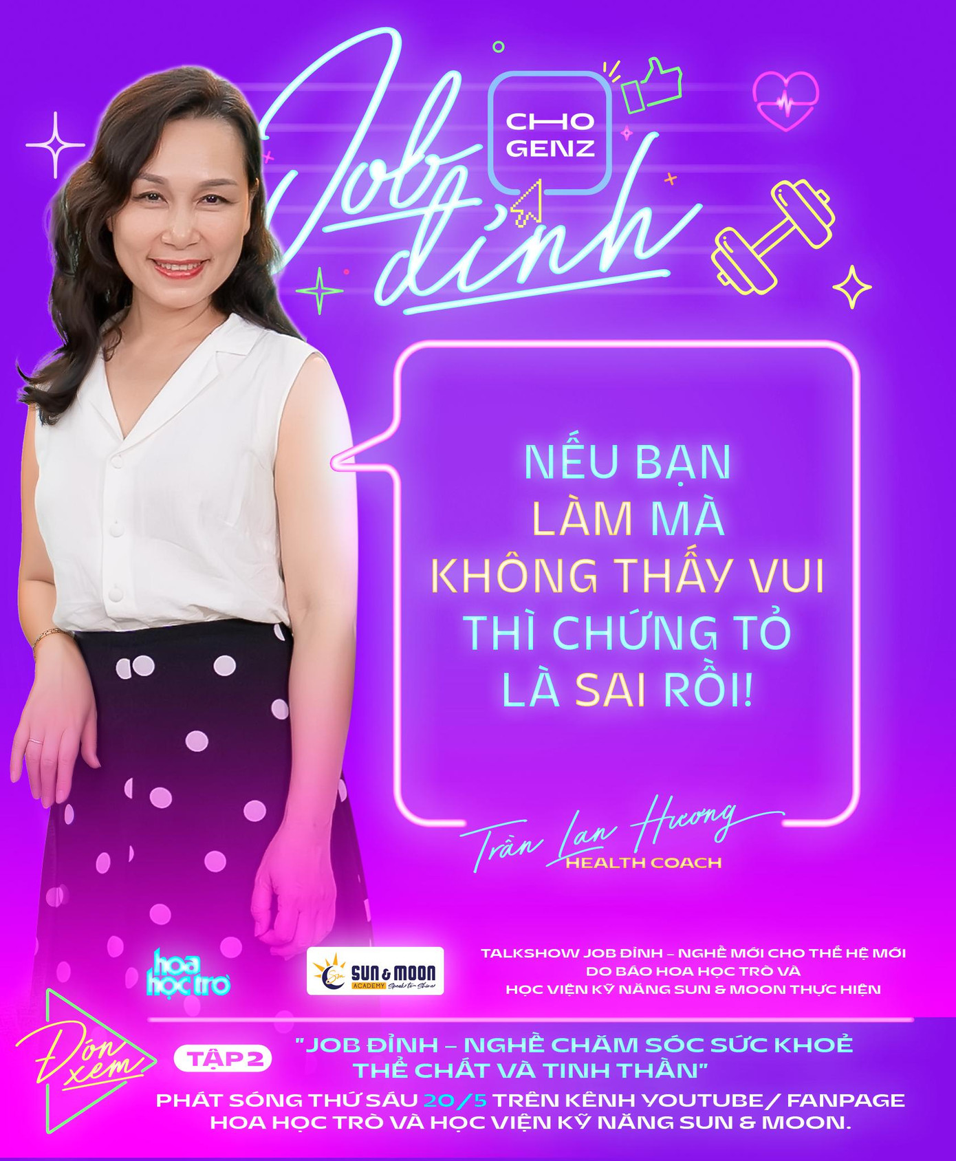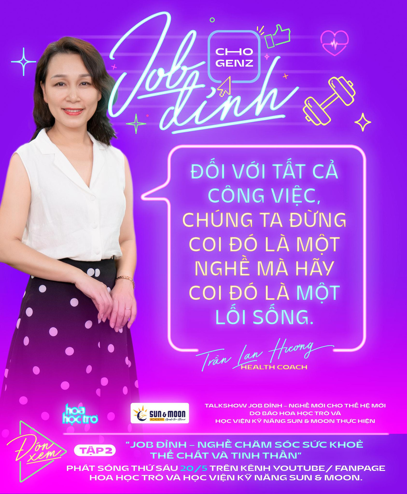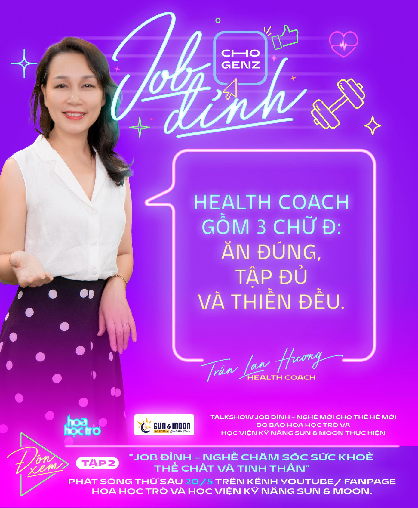 Để khám phá nhiều hơn về công việc ý nghĩa này cũng như “bỏ túi” vô vàn thông tin bổ ích về nghề, mời bạn xem ngay Tập 2 của chuỗi talkshow Job Đỉnh - Nghề mới cho thế hệ mới do báo Hoa Học Trò và Học viện kỹ năng và ngôn ngữ Sun&Moon phối hợp thực hiện, với sự tham gia của 3 vị khách mời: Health Coach Trần Lan Hương, Huấn luyện sức khỏe fitness Sky Coach, Người dẫn dắt và giảng giải Chiêm tinh Mia Cát cùng sự dẫn dắt của host Thanh Thảo nhé: