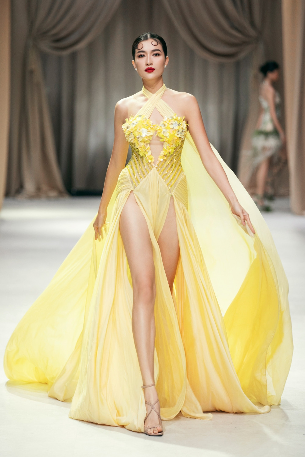 Phần 2 là những thiết kế đặc sắc, cầu kỳ hơn, đánh vào cách xử lý đính kết, tạo phom dáng công phu. Hoa hậu Kỳ Duyên đã đảm nhận rất tốt vai trò mở màn. Thả dáng trong thiết kế đính kết lấp lánh với cách xử lý cầu vai ấn tượng, đường cắt cao quyến rũ, cô được khen đẹp như “nàng tiên băng giá”.