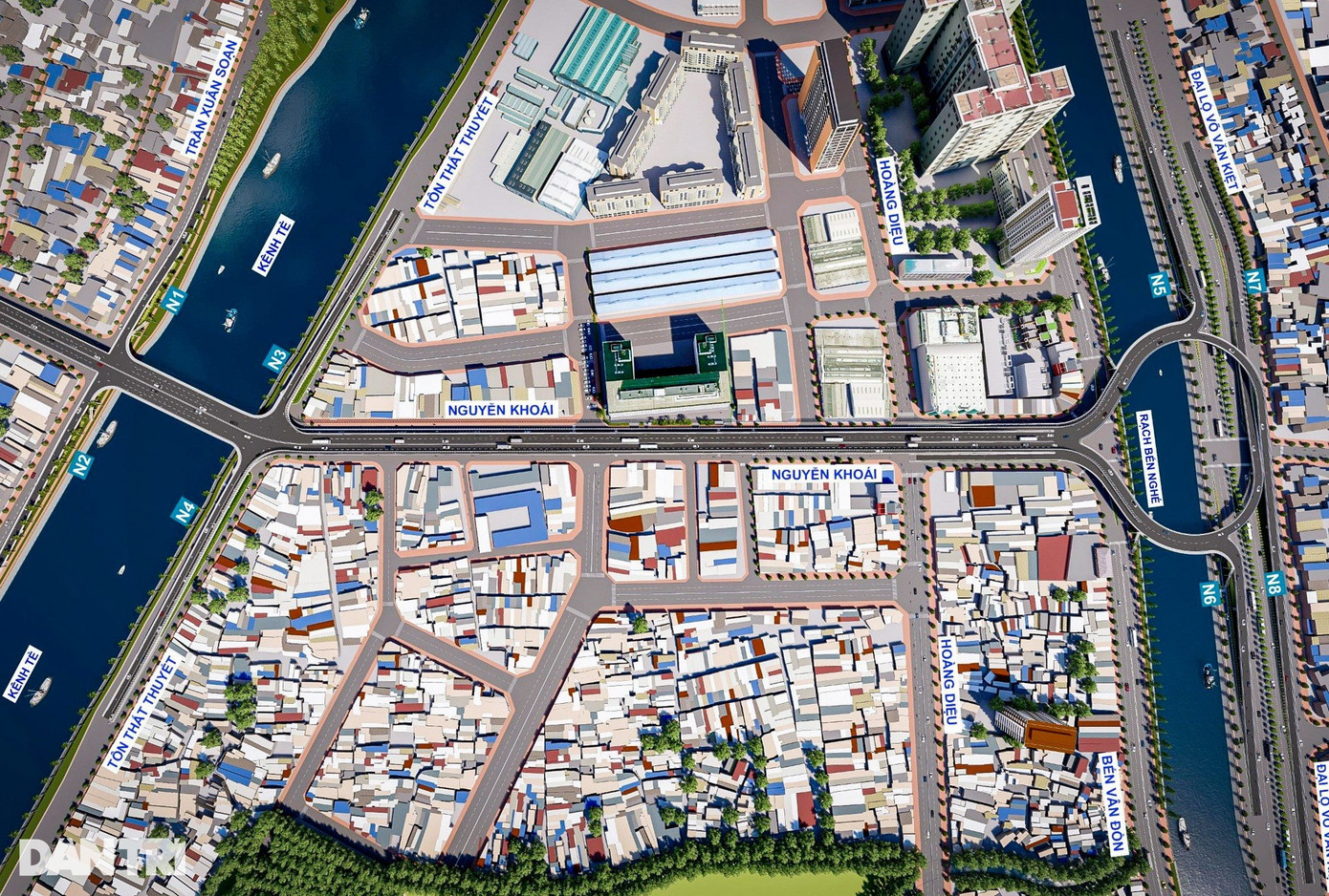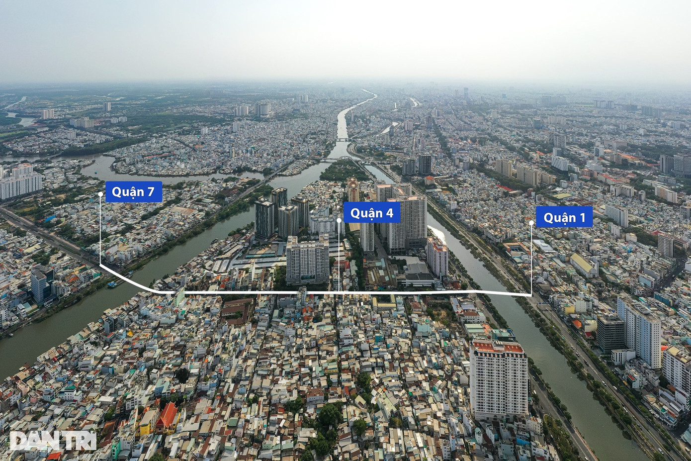 Từ góc nhìn ở đường Nguyễn Khoái, phía bên kia bờ kênh Tẻ là đường Hoàng Trọng Mậu (quận 7) dẫn về khu dân cư Him Lam. Từ đó, người dân có thể di chuyển tiếp đến đường Nguyễn Hữu Thọ hoặc đại lộ Nguyễn Văn Linh.