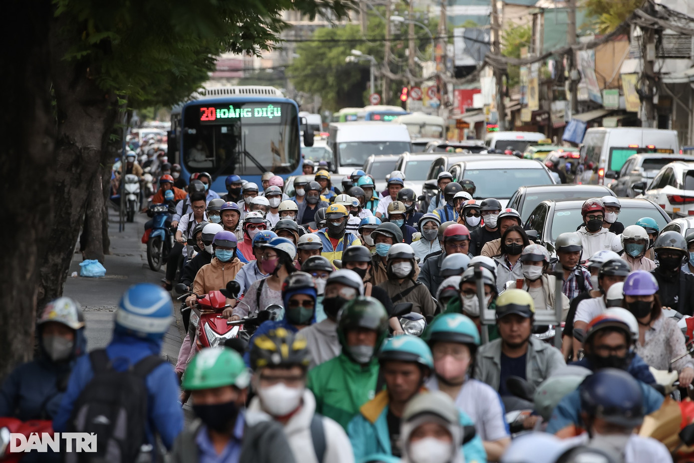 Hình ảnh dòng xe kẹt cứng trên đường Nguyễn Tất Thành (quận 4) chờ di chuyển qua quận 1. Đây là con đường huyết mạch nối liền 3 quận: quận 7,4 và quận 1.