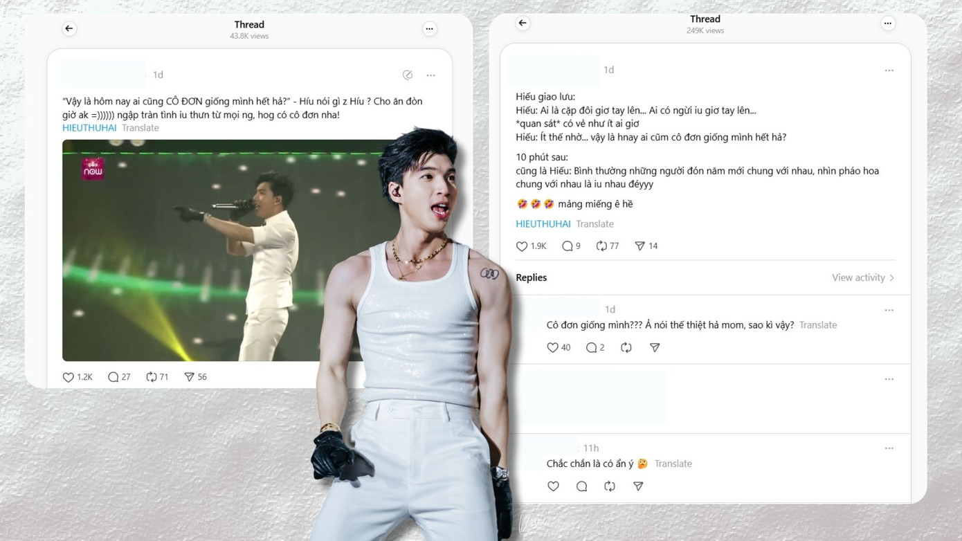 Mới nhất, trong sự kiện chào năm mới 2025 tại Hà Nội, HIEUTHUHAI giao lưu với khán giả trước khi tiếp tục trình diễn: "Vậy là hôm nay ai cũng cô đơn giống mình hết hả?".