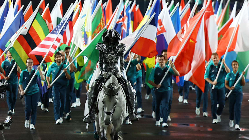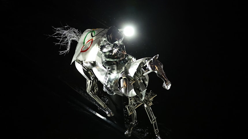 Lễ khai mạc thêm cuốn hút với sự xuất hiện của nhân vật bí ẩn mặc giáp và cưỡi ngựa kim loại trên sông Seine rồi tiến về quảng trường Trocadero. Người này mang theo cờ Olympic để tiến hành nghi thức thượng cờ.
