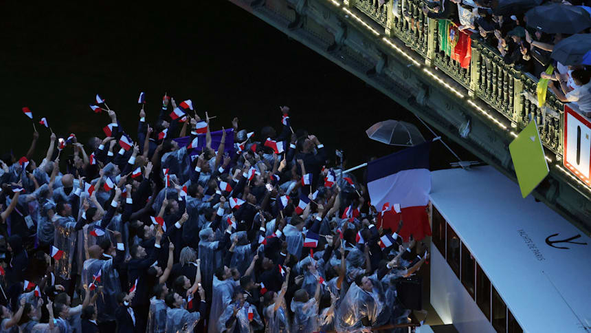 Trên cây cầu bắc qua sông Seine, một làn khói khổng lồ với ba màu lam, trắng và đỏ, tượng trưng cho Quốc kì Pháp được phun bay lên cao, như lời chào của nước chủ nhà với thế giới, cũng là mở màn cho phần diễu hành của các đoàn thể thao tham dự Thế vận hội.