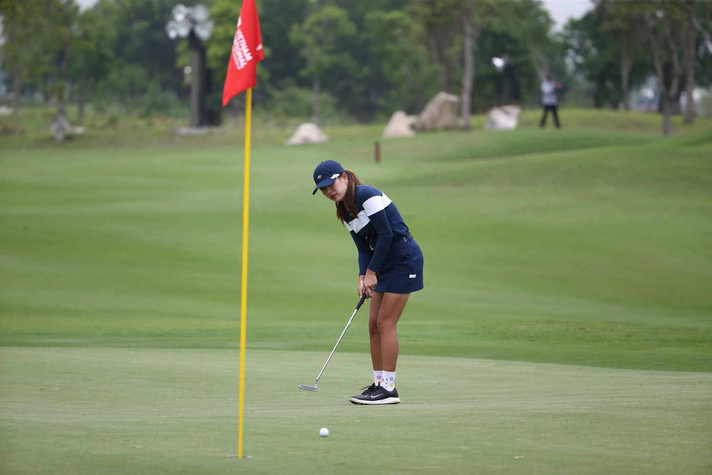 Tuyển thủ quốc gia Phạm Thị Yến Vy đang chuẩn bị thực hiện một cú putt (gạt bóng).