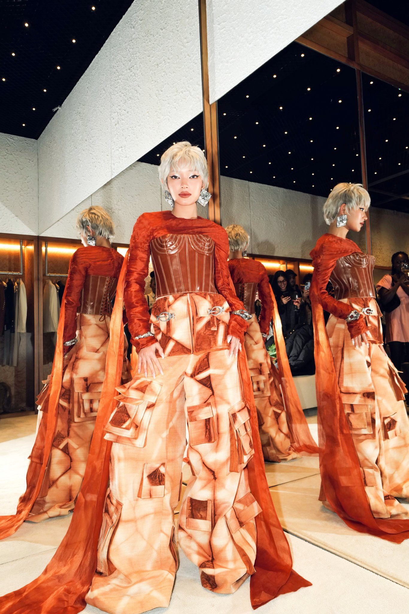 Tham dự sự kiện triển lãm với vai trò khách mời đặc biệt, Châu Bùi diện thiết kế thuộc bộ sưu tập “Mirage” đậm tính độc bản. Tổng thể trang phục màu cam cháy kết hợp dáng áo ôm sát cùng vạt dài lạ mắt được chế tạo từ 100% sợi tơ sống. Được biết, chất vải này ứng dụng cách nhuộm thủ công từ củ nâu tự nhiên để tạo ra tông màu cam đặc trưng của vùng đất đỏ Tây Bắc.