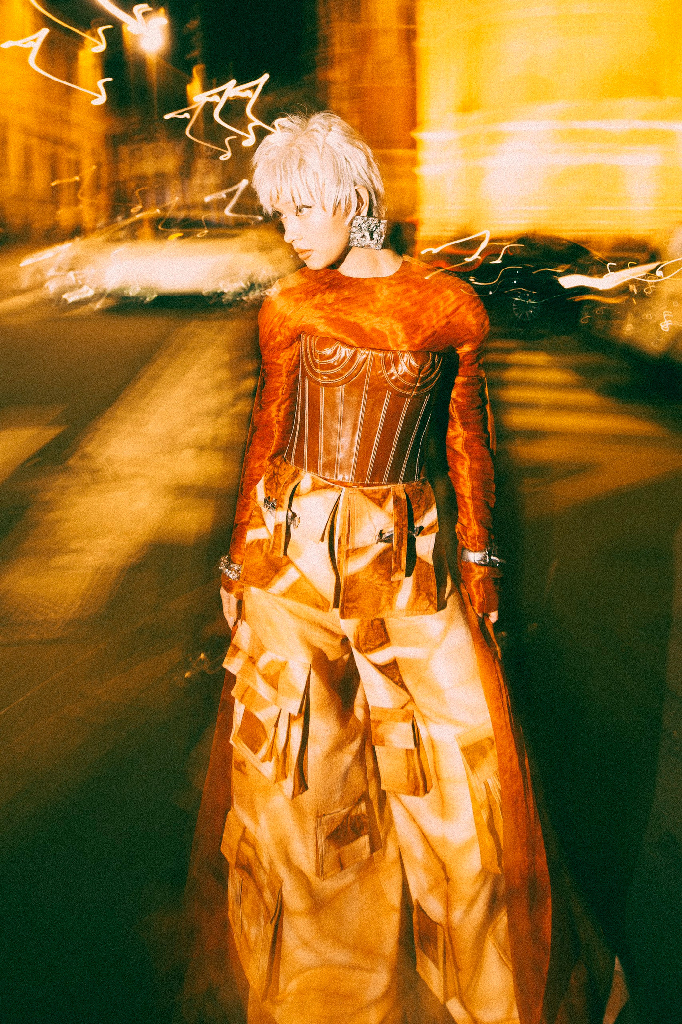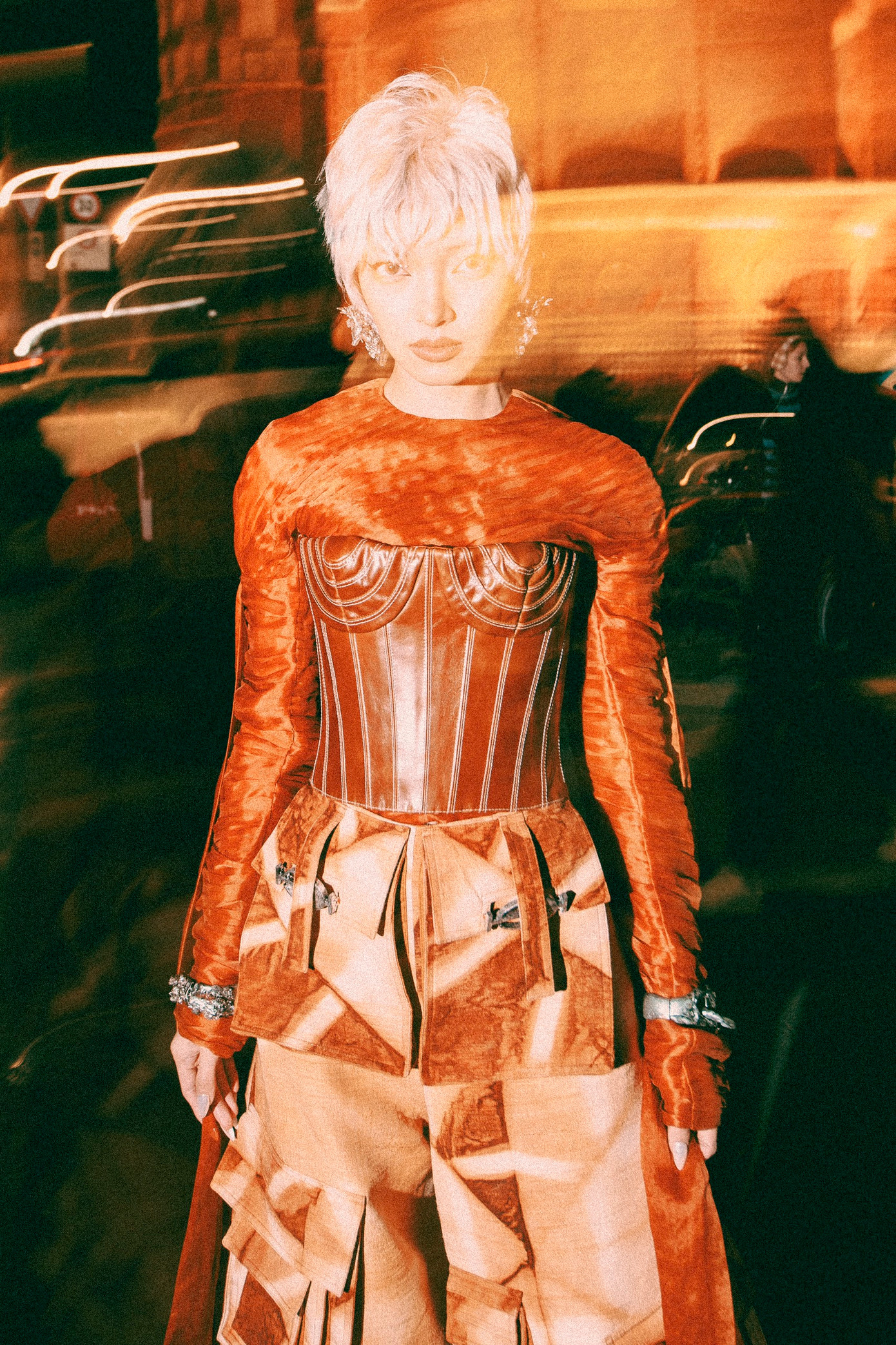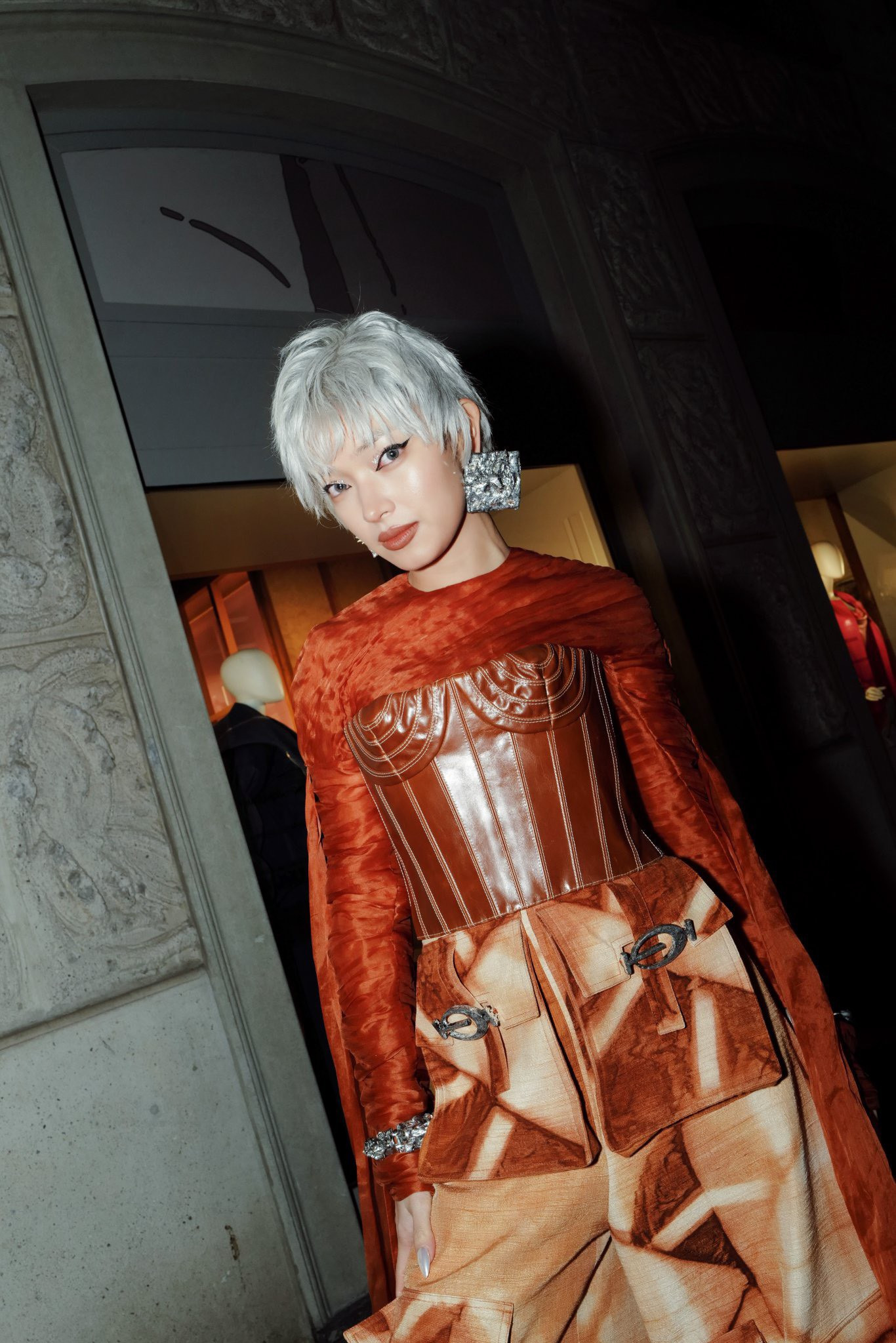 Cách kết hợp phần áo vải tơ sợi cùng corset da tái chế tạo tỉ lệ đối nghịch thu hút thị giác, đặc biệt ở điểm nhấn các đường gân nổi tinh tế. Thiết kế quần baggy cùng những mảng màu hình khối là điểm nhấn cá tính năng động, trẻ trung và đặc biệt phù hợp với vóc dáng của Châu Bùi.