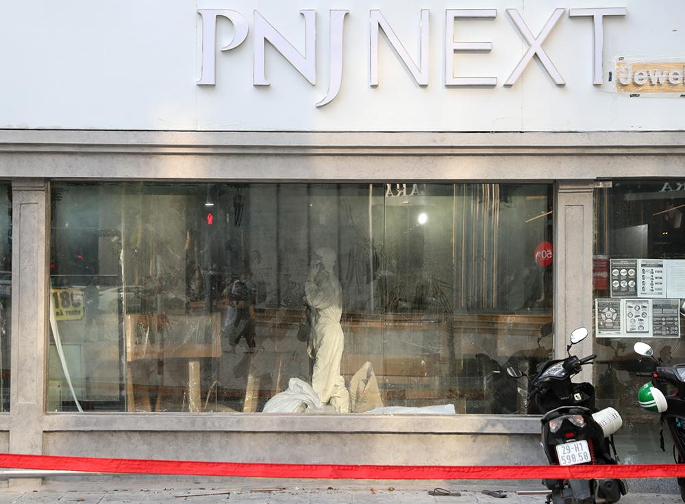 Lực lượng chức năng lập rào chắn phong tỏa cửa hàng trên phố Bà Triệu, nơi F0 từng đến, để lấy mẫu xét nghiệm nhân viên tại đây.