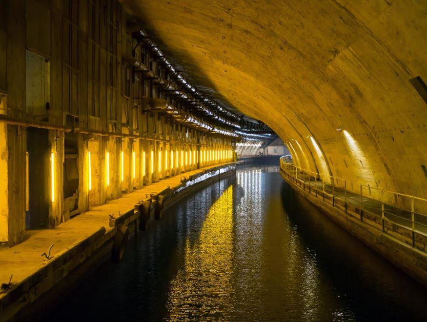 Các tàu ngầm hạt nhân được cất giữ và sửa chữa ở đây, cùng với đạn dược. Các cửa dẫn nước nặng 150 tấn và các bức tường gia cố của căn cứ được thiết kế để chống lại một cuộc tấn công hạt nhân.