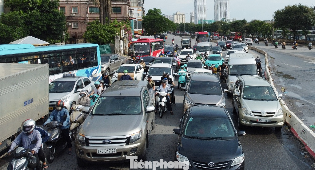 Việc mặt bằng nút giao Giải Phóng - Kim Đồng bị hàng rào thu hẹp hơn một nửa dẫn đến giao thông đi lại khó khăn, nhất là giờ cao điểm. Ảnh chụp chiều 16/7.