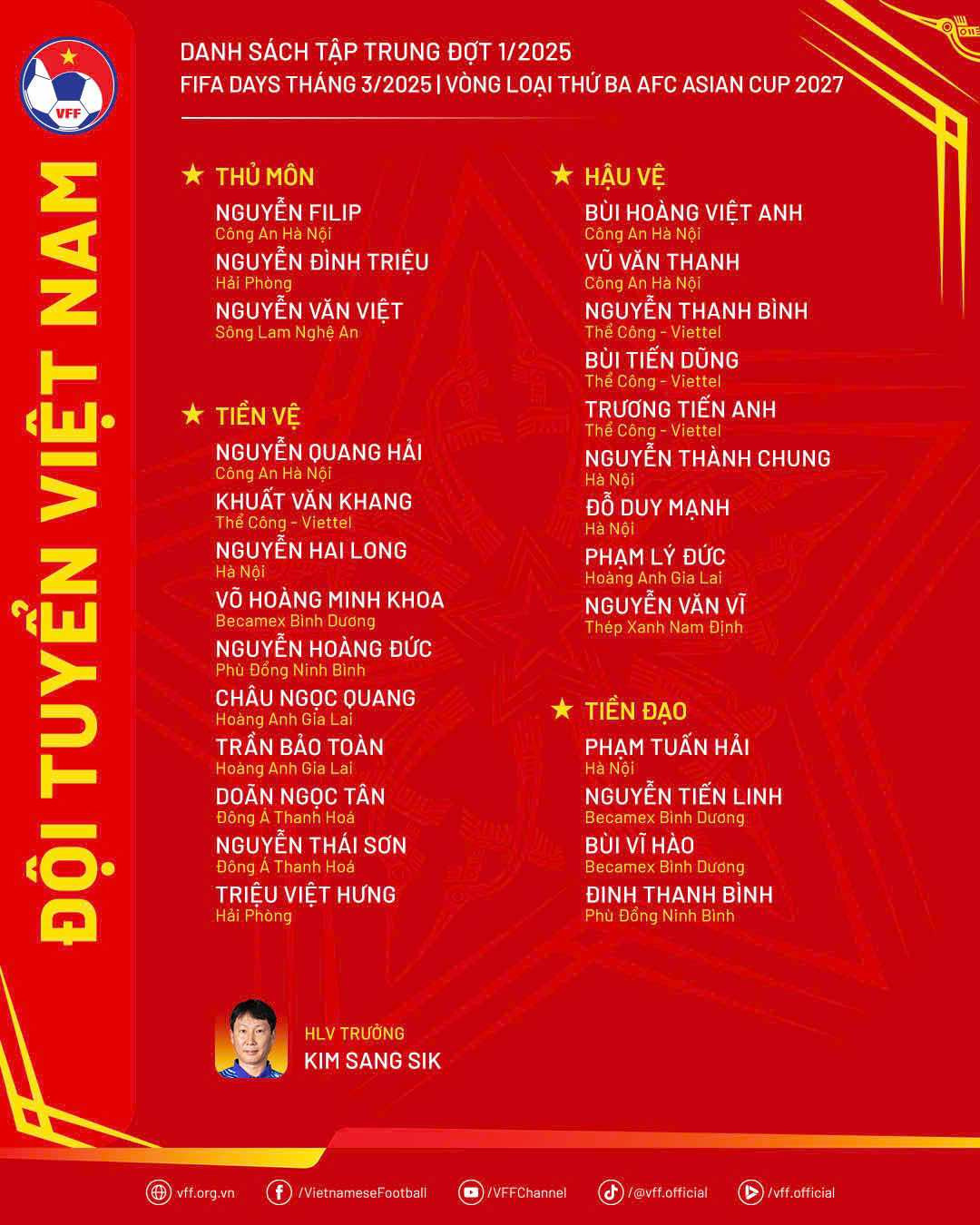Hàng tiền đạo là tuyến ổn định nhân sự nhất của đội tuyển trong đợt hội quân tháng 3. Quả bóng vàng Việt Nam 2024 Nguyễn Tiến Linh, Tuấn Hải, Vĩ Hào và Thanh Bình sẽ chia sẻ nhiệm vụ ghi bàn trước Lào và Campuchia.