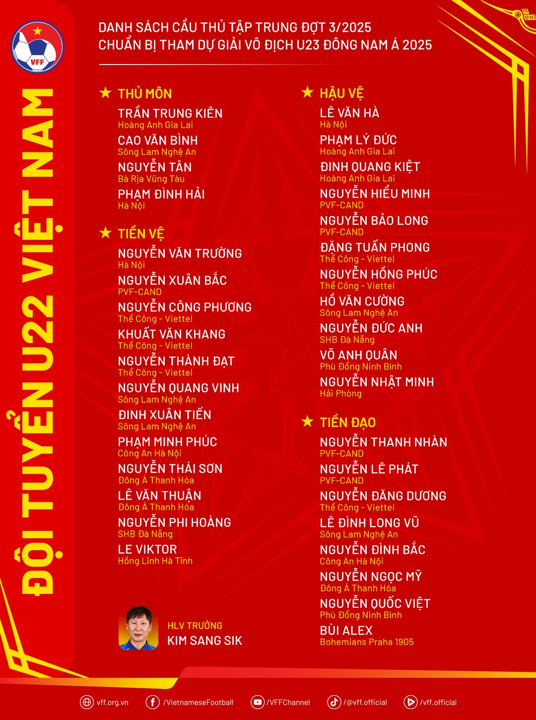 Ở danh sách này, những cái tên quen thuộc đã nhiều năm khoác áo đội trẻ Việt Nam như Thái Sơn, Xuân Tiến, Văn Khang, Văn Trường, Văn Cường, Văn Bình hay Đình Bắc đều xuất hiện. Sự trở lại của Đình Bắc là rất quan trọng đối với đội tuyển vì anh là một trong những phương án tạo khác biệt của HLV Kim Sang Sik.