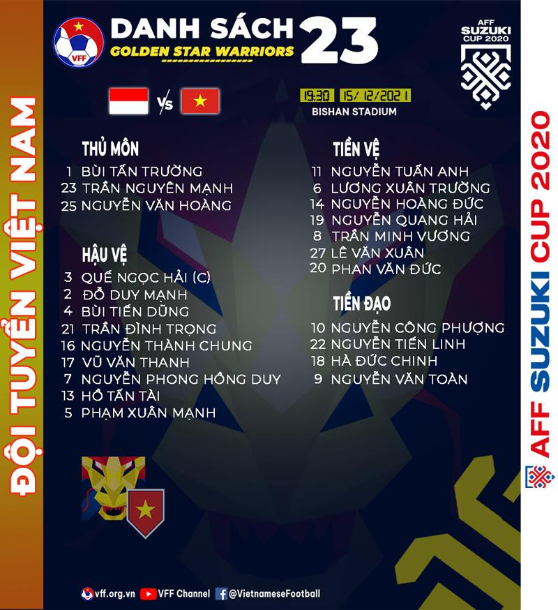 Theo đó, ĐT Việt Nam có một sự thay đổi so với trận thắng Malaysia 3-0 ngày 12/12. Đó là sự góp mặt trở lại của tiền vệ Trần Minh Vương, thay cho Phạm Đức Huy.
