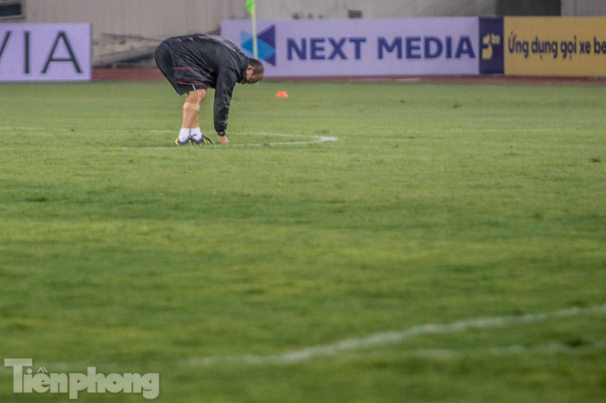 Ông thầy người Hàn Quốc tỏ ra rất kỹ lưỡng khi đi kiểm tra cỏ ở mọi điểm trên sân.