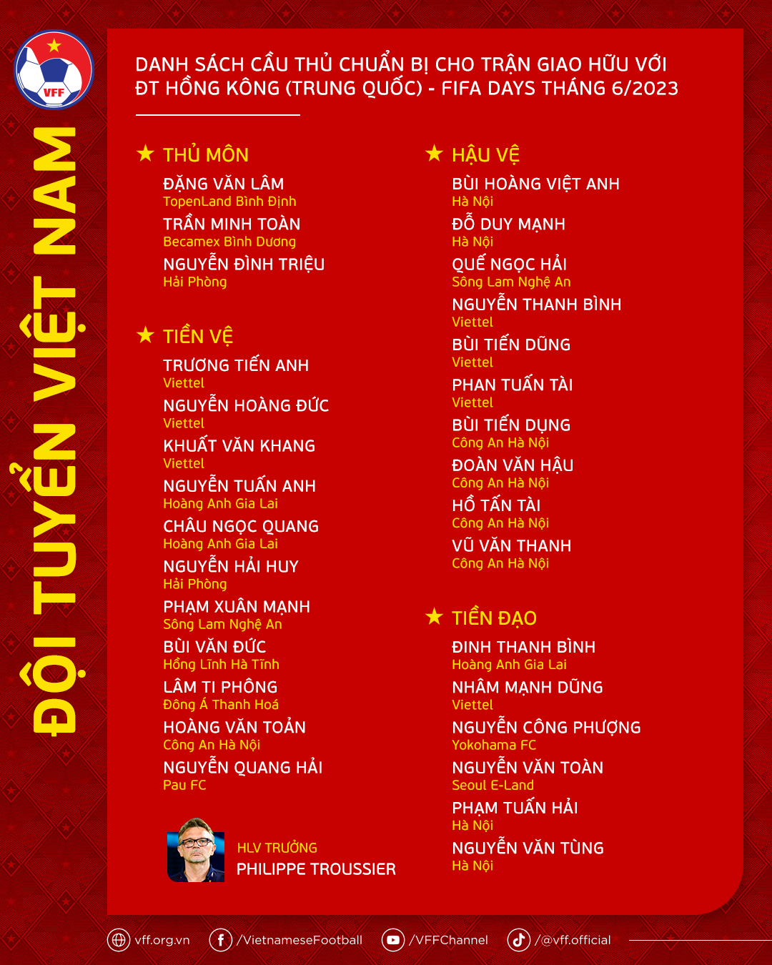 Ngoài ra, HLV Philippe Troussier cũng lựa chọn 4 cầu thủ xuất sắc trong đội hình ĐT U23 Việt Nam lên khoác áo ĐT Việt Nam. Đó là hậu vệ Phan Tuấn Tài, tiền vệ Khuất Văn Khang, Hoàng Văn Toản và tiền đạo Nguyễn Văn Tùng.