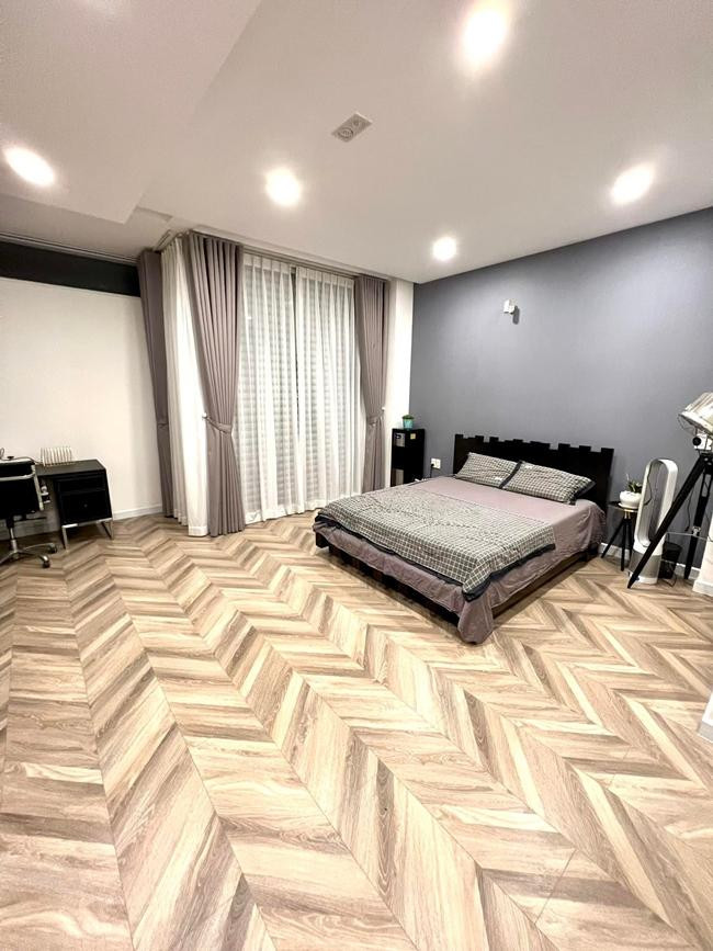 Phòng ngủ theo tiêu chí đơn giản, rộng rãi, được lót sàn giả gỗ tạo cảm giác ấm cúng. Không những thế, nam ca sỹ Không Cảm Xúc còn dành riêng một mini bar để trưng bày những thành tích mà anh đạt được trong sự nghiệp của mình.