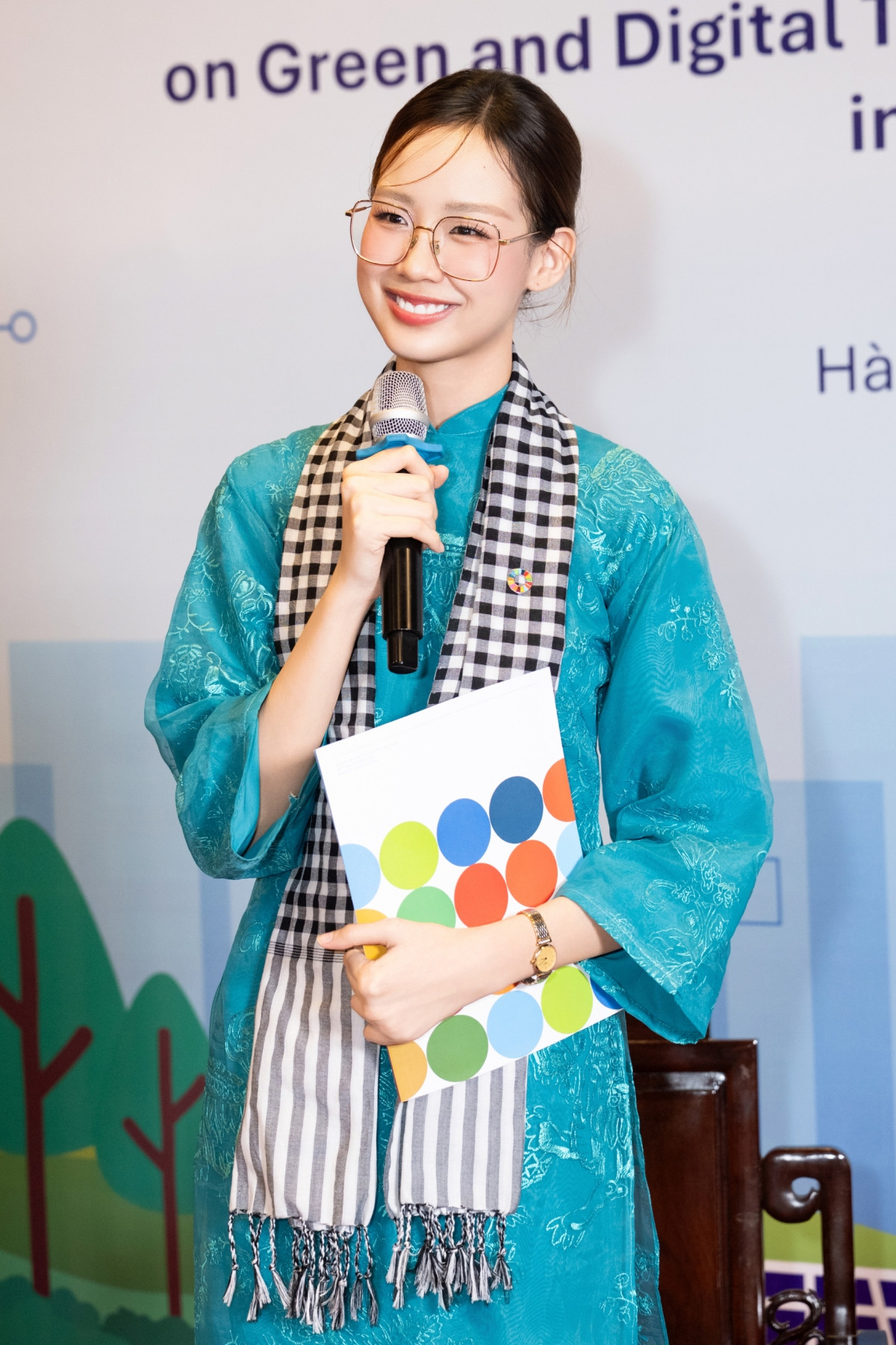 Với vai trò người điều phối của chương trình, Hoa hậu Bảo Ngọc đã thể hiện xuất sắc hình ảnh của một người trẻ bản lĩnh, trí tuệ và trách nhiệm. Diện tà áo dài màu xanh kết hợp cùng khăn rằn truyền thống, hình ảnh Bảo Ngọc không chỉ tôn vinh vẻ đẹp văn hóa dân tộc mà còn thể hiện sự gần gũi, đúng như tinh thần “xanh” và “số” mà sự kiện hướng tới.