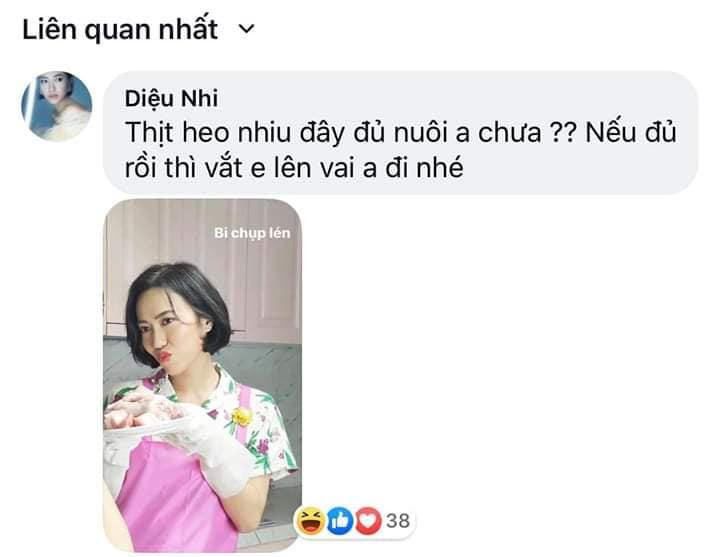 Ngay sau đó, bên dưới bài đăng của Isaac, Diệu Nhi cũng nhanh chóng “thả nhẹ” bức ảnh của mình với biểu cảm dễ thương cùng "thính thơm": “Thịt heo nhiêu đây đủ nuôi anh chưa? Nếu đủ rồi thì vắt em lên vai đi anh nhé!”.