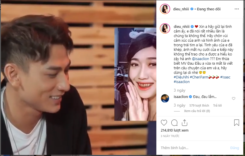 Trước đó, quản lý của Isaac từng hài hước tung loạt ảnh được xem là bằng chứng “tố” Diệu Nhi công khai “thả thính” nam ca sĩ bằng thịt heo. Cụ thể, khi Isaac đăng ảnh khoe nhan sắc điển trai trên trang cá nhân kèm lời than thở: “Phải chăng kiếp trước đa tình, kiếp này chẳng có mối tình vắt vai?”.