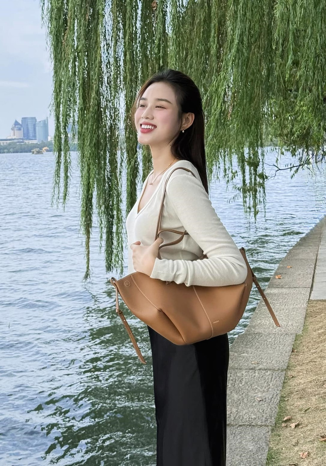 Nàng hậu không quên khoe khéo chiếc túi màu nâu với hai món phụ kiện thú bông xinh xắn. Mẫu túi có tên Polène Cyme đến từ thương hiệu Polène của Pháp và được các chị em khen là chiếc túi đáng mua nhất năm 2025.