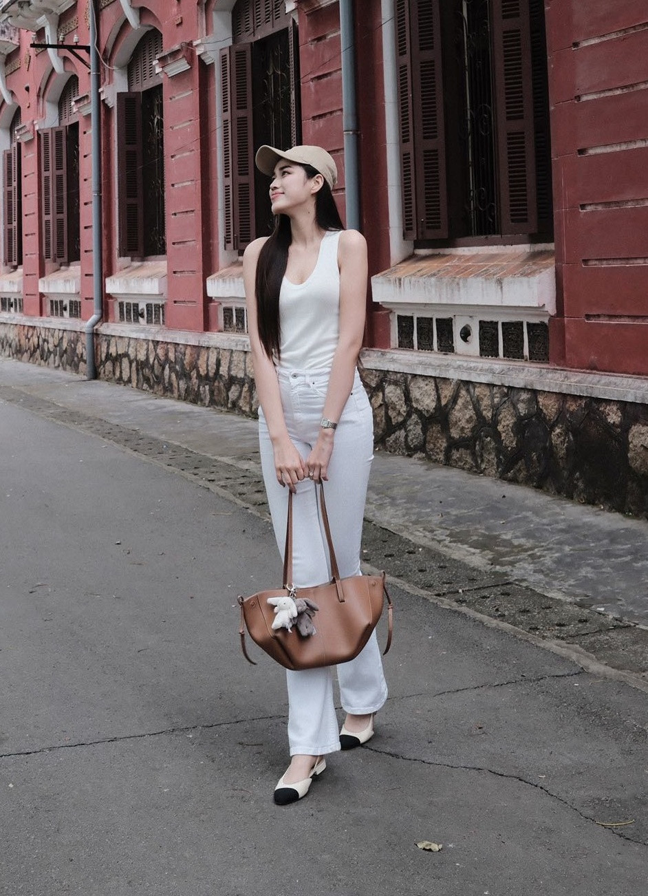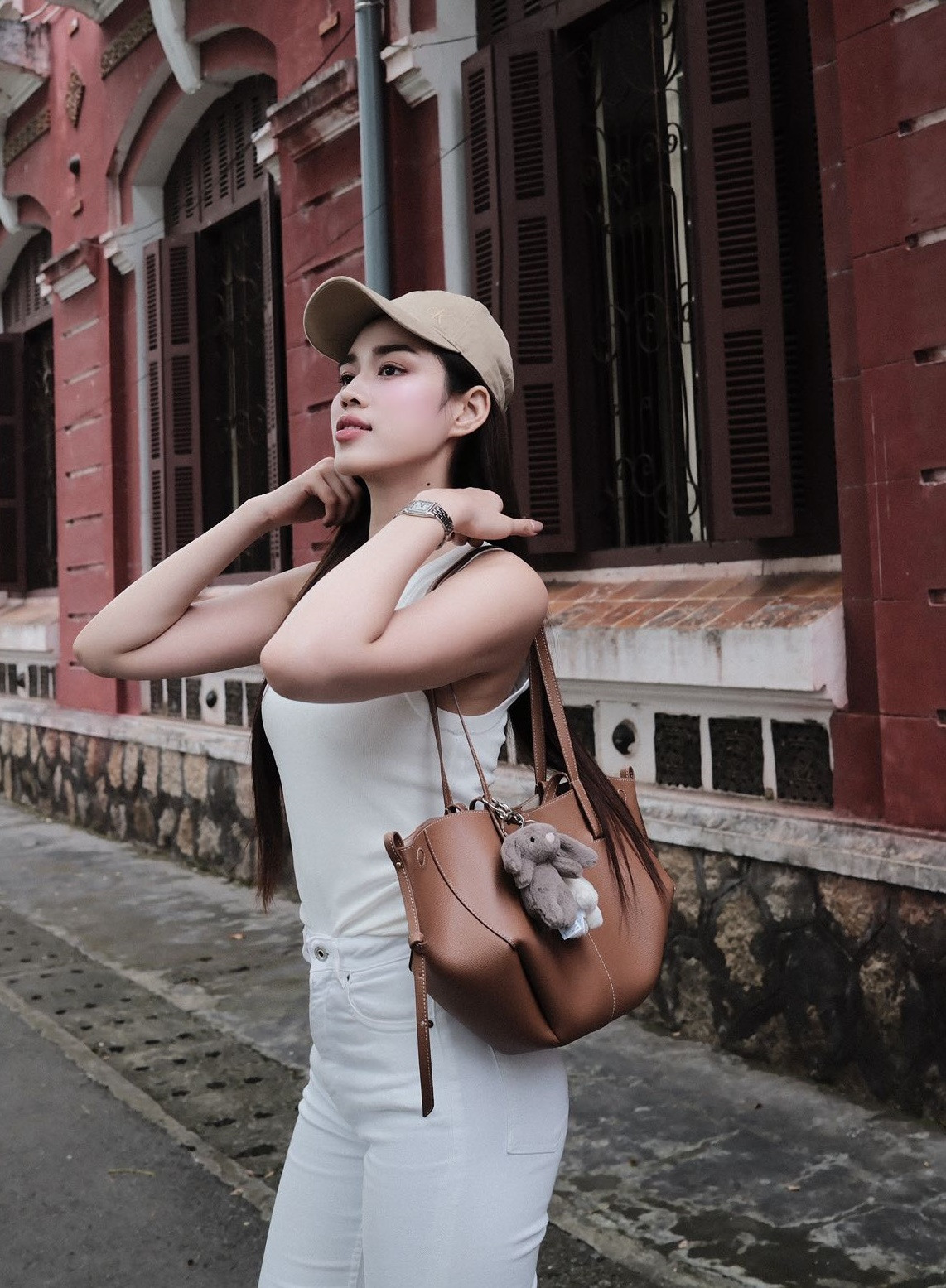 Kiểu dáng rộng rãi giúp chiếc túi đựng được rất nhiều đồ bên trong nên Hoa hậu Đỗ Thị Hà thường sử dụng trong các chuyến du lịch. Mẫu túi nàng hậu dùng có giá hơn 12 triệu đồng và Đỗ Thị Hà rất khéo léo khi chọn màu nâu trung tính, dễ kết hợp với nhiều trang phục khác nhau.