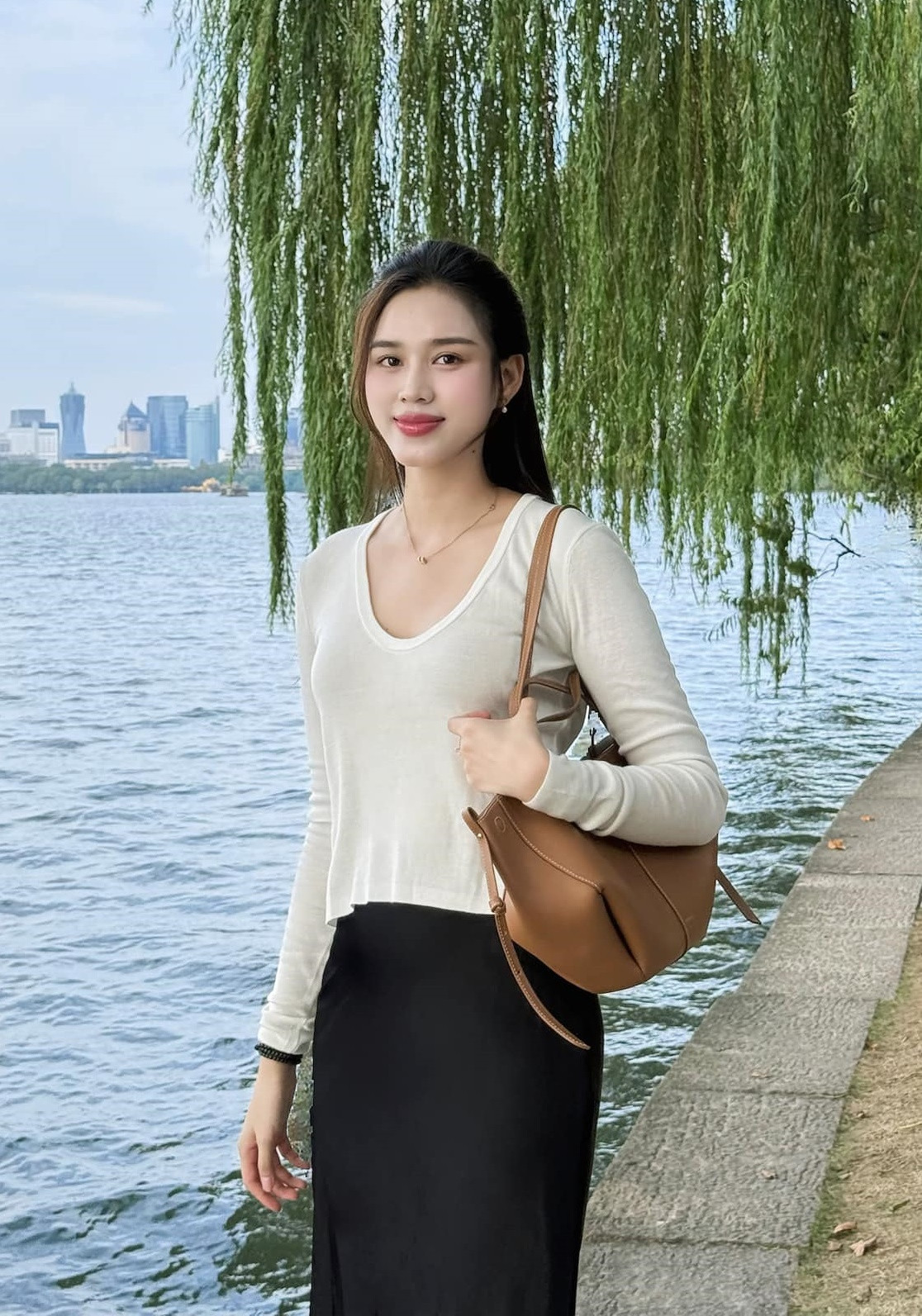 Trong chuyến đi Thượng Hải hồi tháng 10 năm ngoái, Hoa hậu Đỗ Thị Hà cũng mang theo chiếc túi này. Tuy có dáng tote nhưng mẫu túi có đường gập lạ mắt ở đáy, những đường cắt chéo giúp nhìn mềm mại bắt mắt hơn.