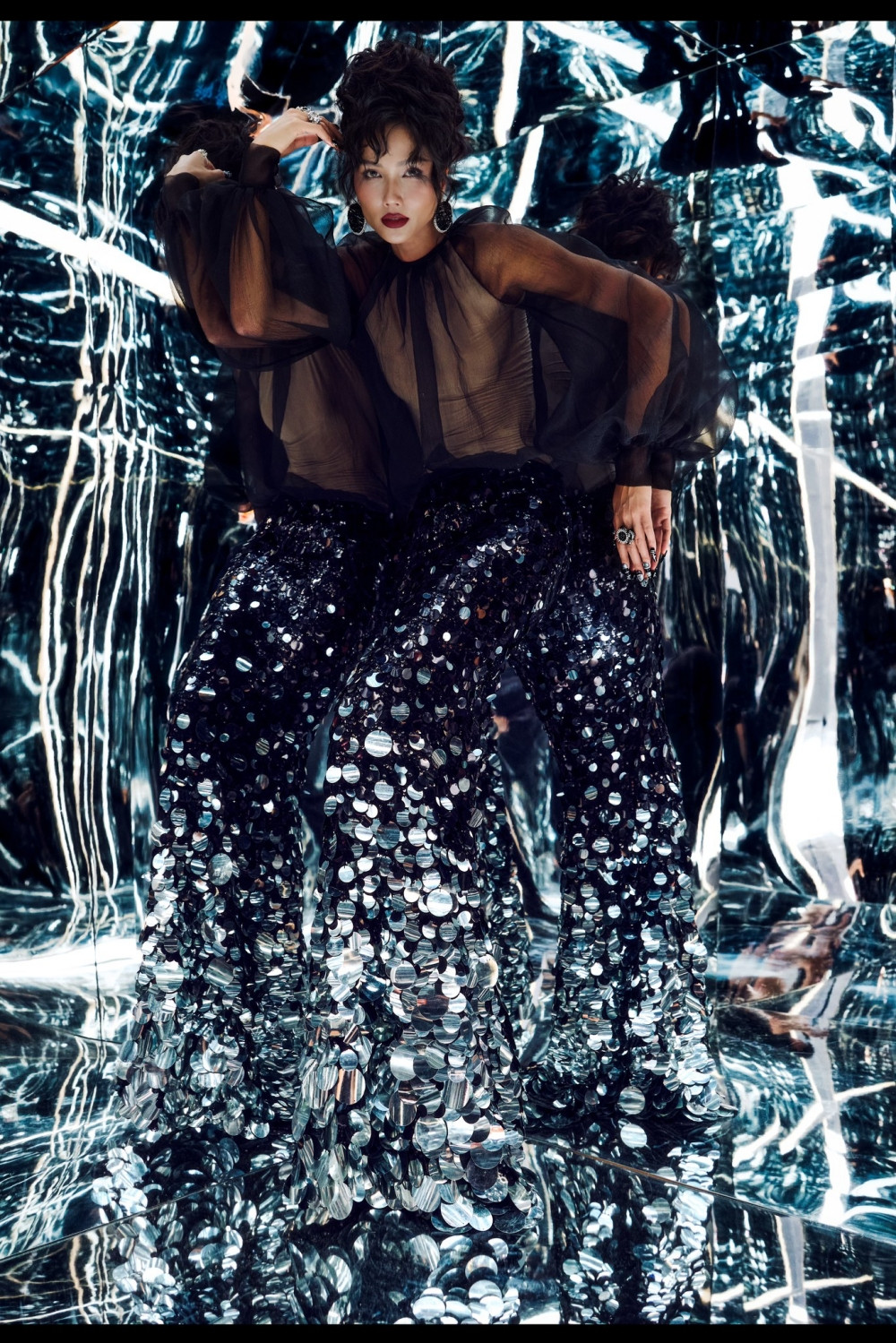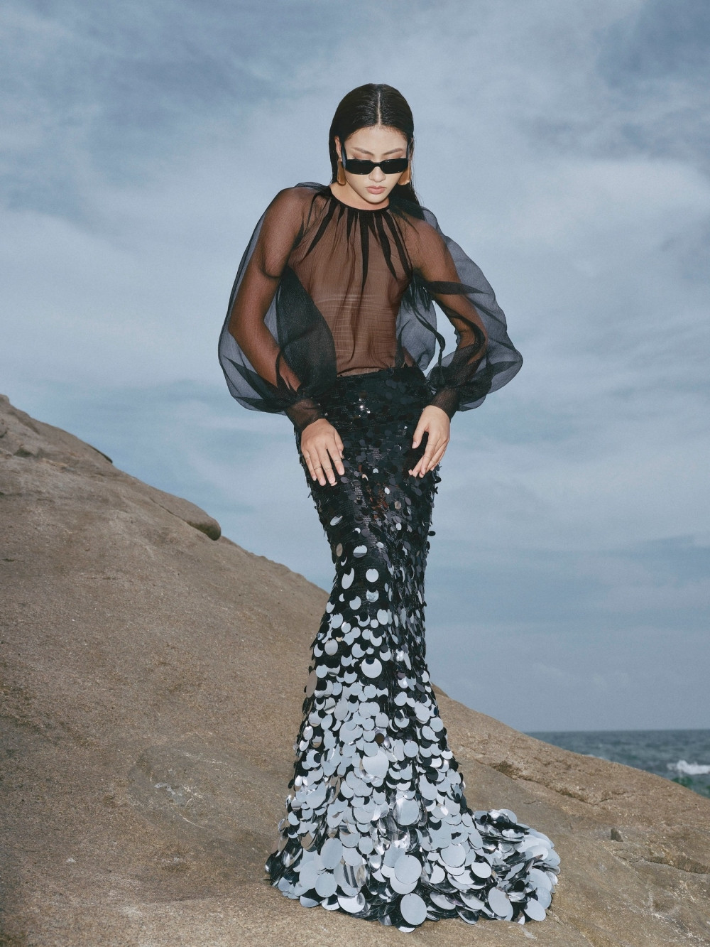 Thiết kế màu đen với phần chân váy ôm sát đính sequin lấp lánh nằm trong BST Resort 2024 của NTK Lê Thanh Hòa.