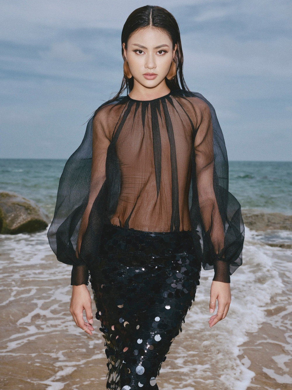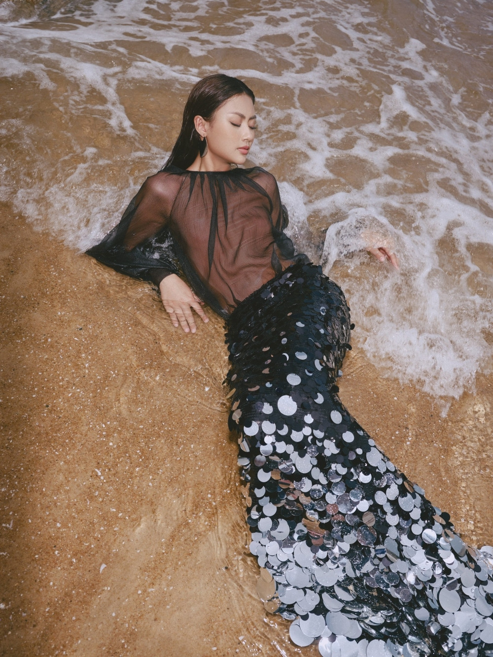 Miss Cosmo Vietnam 2023 Bùi Thị Xuân Hạnh là người đầu tiên diện thiết kế này, trong bộ ảnh quảng cáo cho BST. Nàng hậu có những bức ảnh đẹp mắt, hòa cùng sóng biển, giống như một “nàng tiên cá” thực thụ.