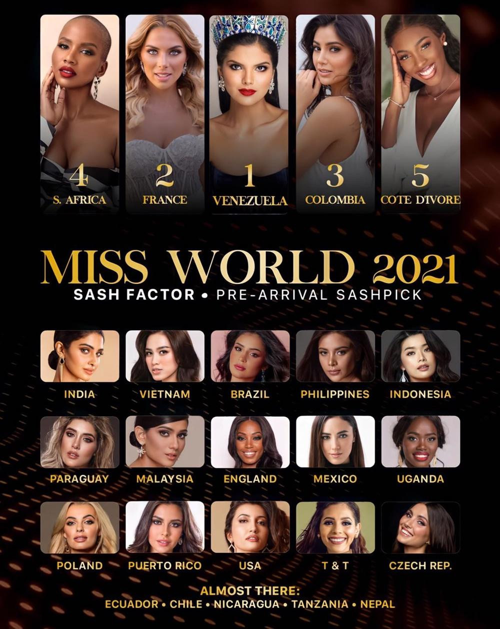 Mới đây, theo BXH Pre-Arrival của Sash Factor, Hoa hậu Đỗ Thị Hà được chuyên trang này đánh giá ở vị trí thứ 7. Đây là một vị trí khá cao, nằm trong Top 10, tuy nhiên nó chỉ là ý kiến riêng của Sash Factor, không phải xếp hạng của BTC Miss World 2021.